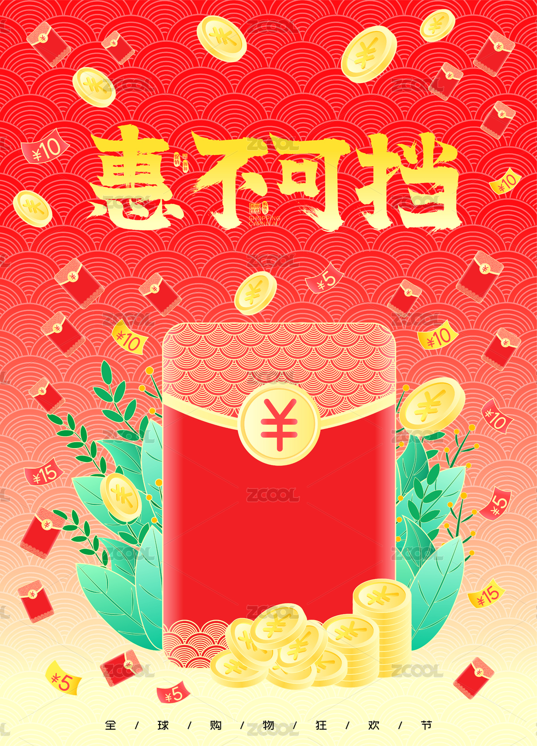 购物狂欢惠不可挡红包雨矢量插画海报