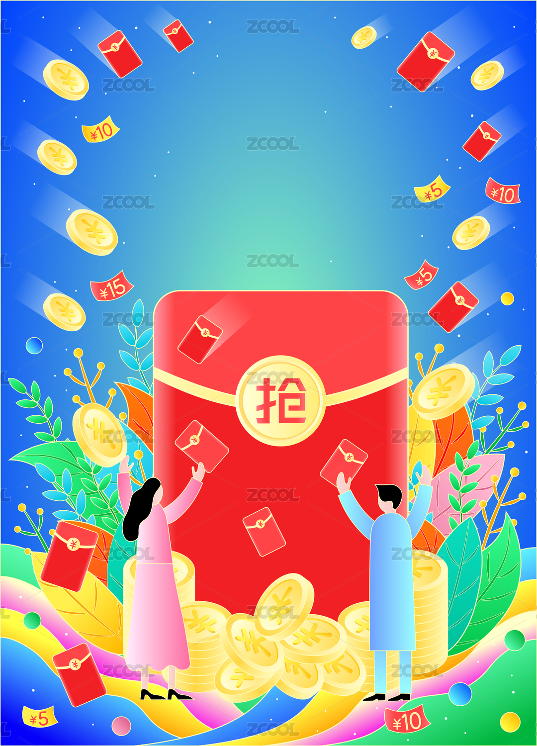 炫彩国潮抢红包优惠券红包雨金币矢量插画
