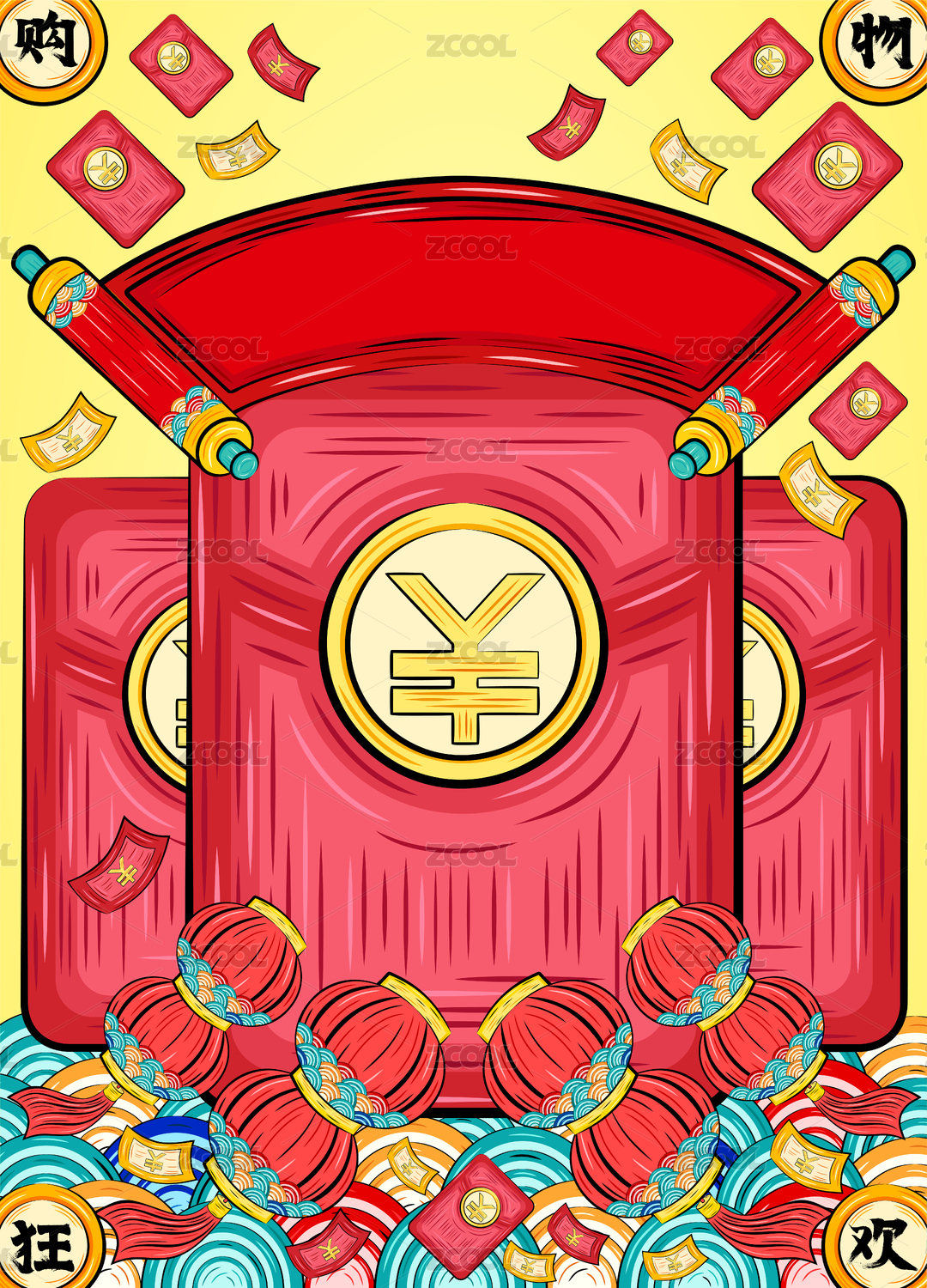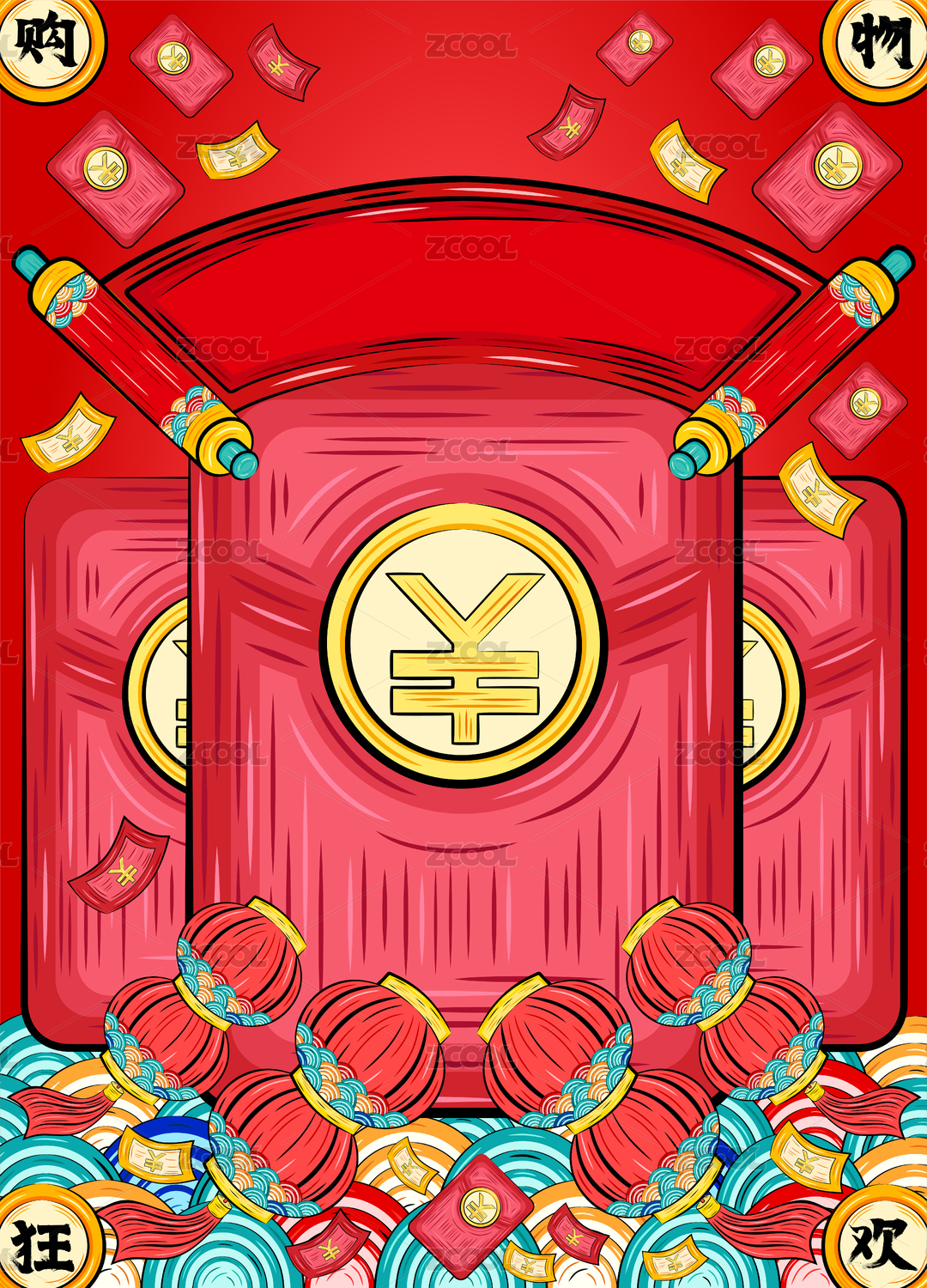 国潮红包雨灯笼赐福购物狂欢矢量插画