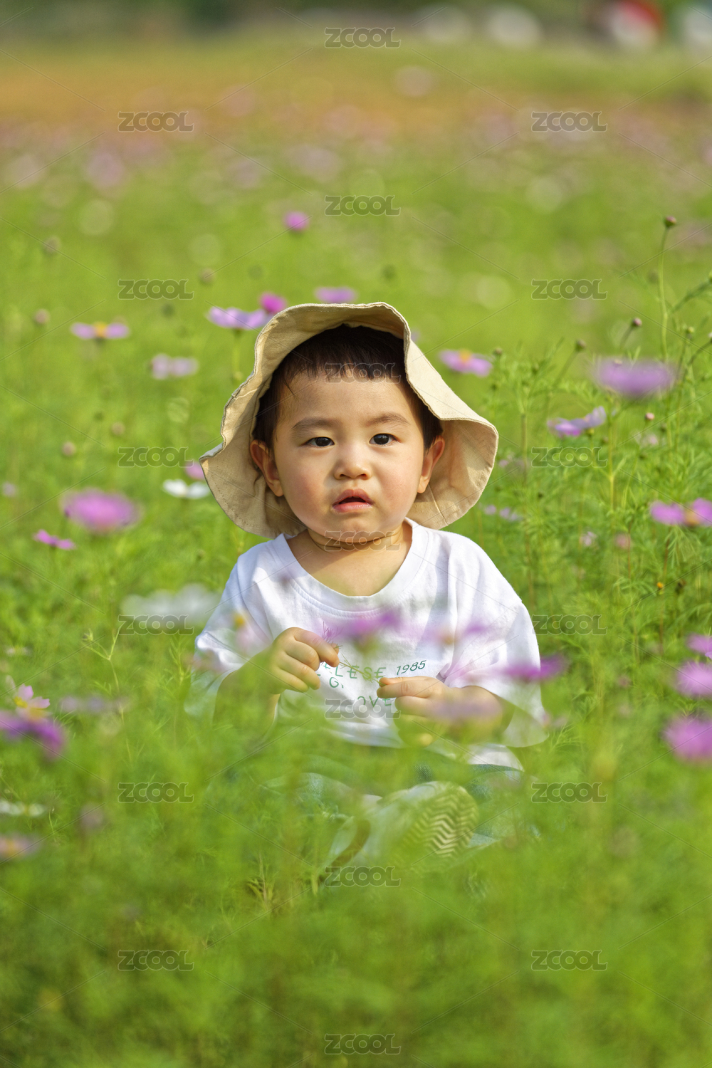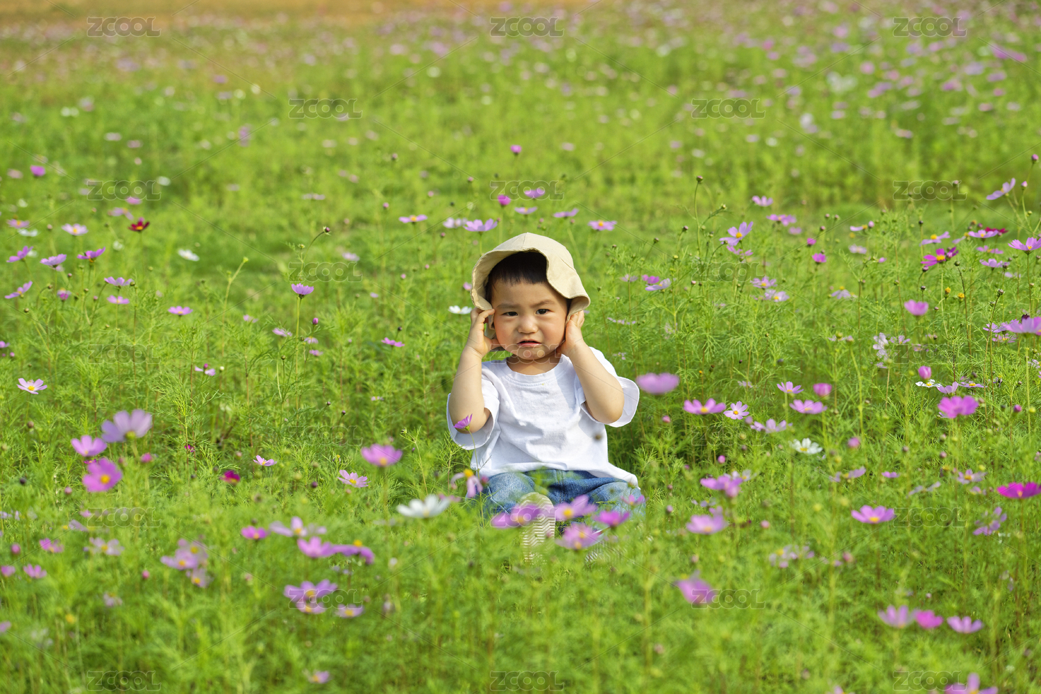一个戴帽子的小男孩坐在花丛中捂住耳朵