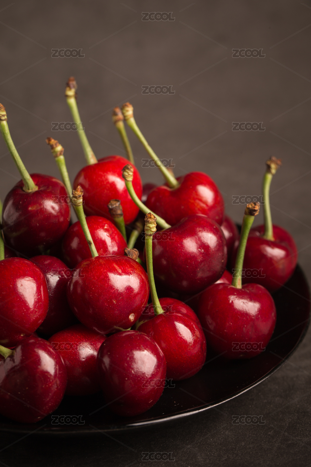 多个带柄的车厘子放在黑色的背景中