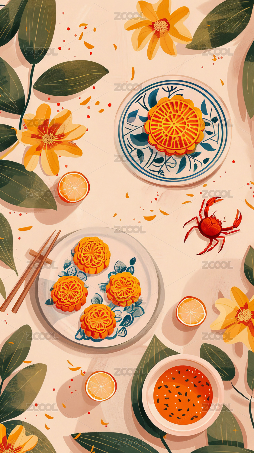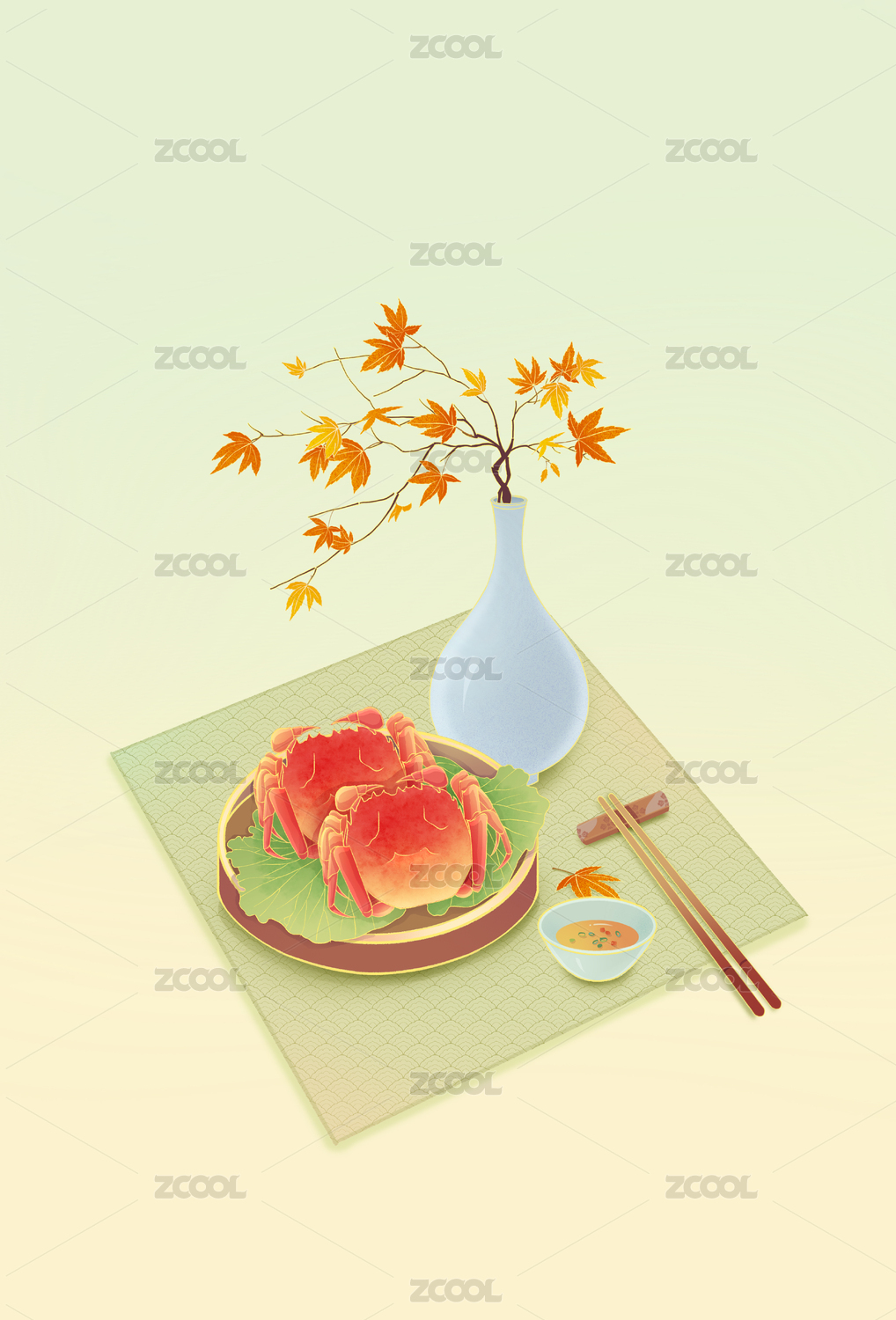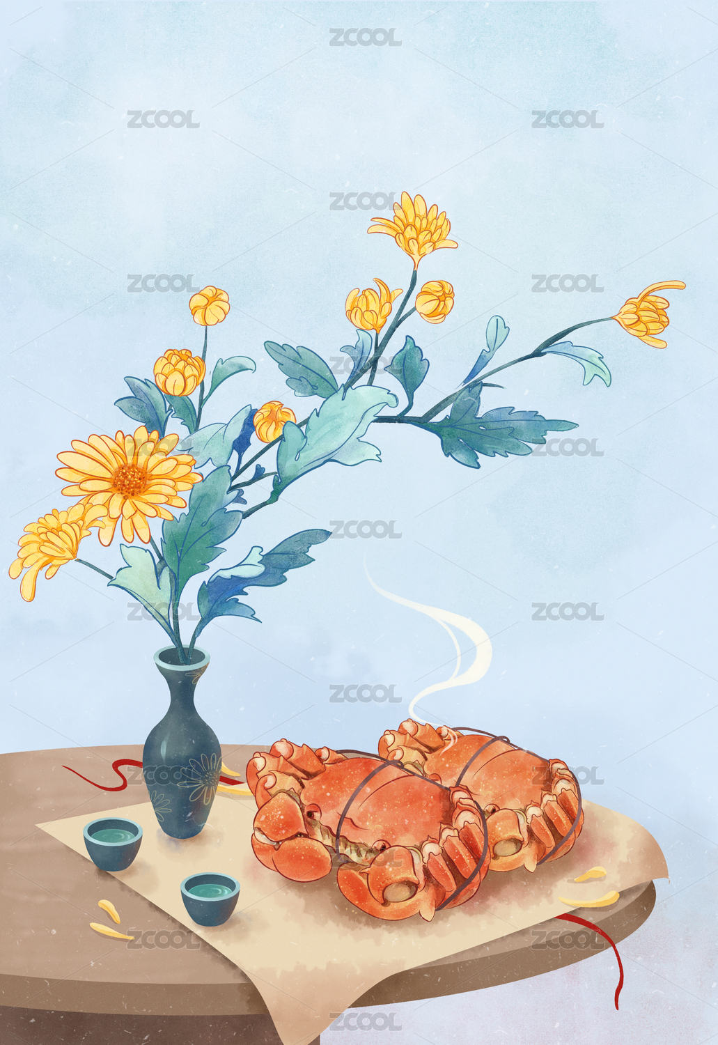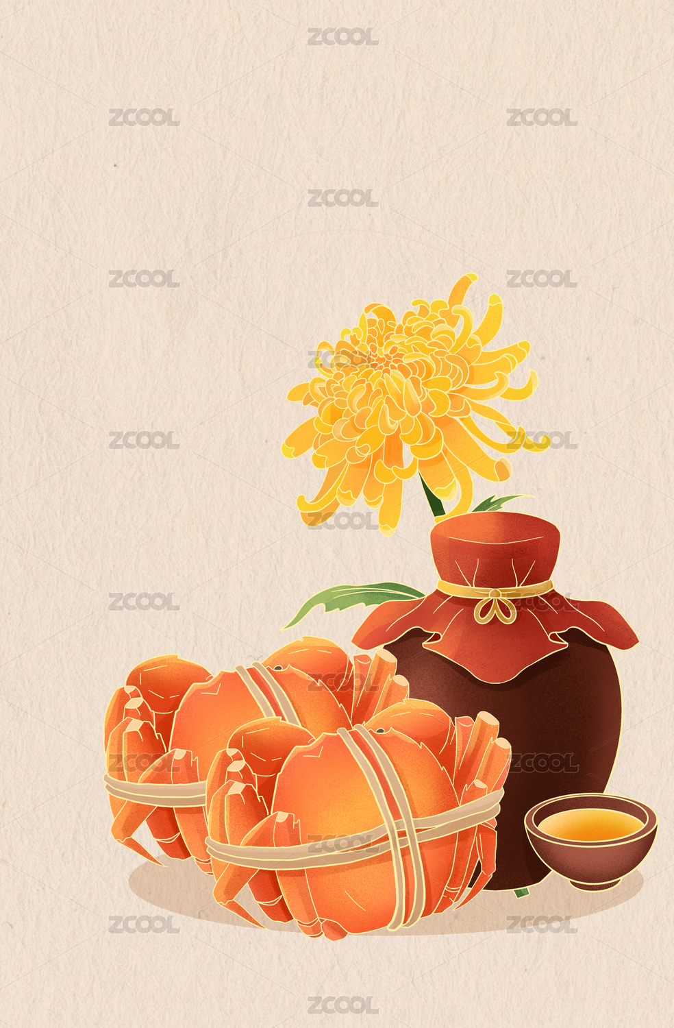 国庆节重阳节赏菊螃蟹寒露霜降节气菊花酒中国风竖幅