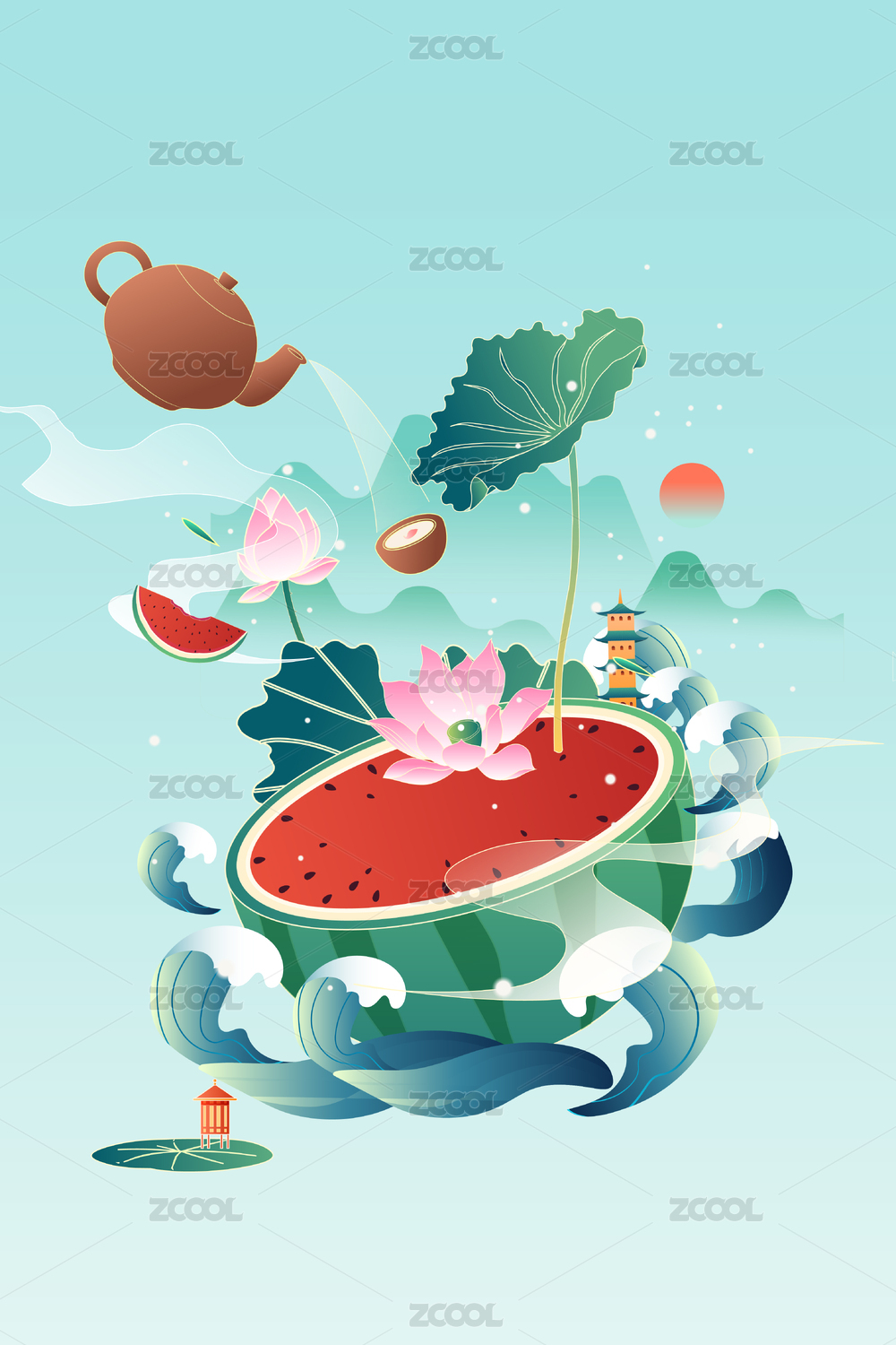 国潮夏天西瓜荷花矢量插画