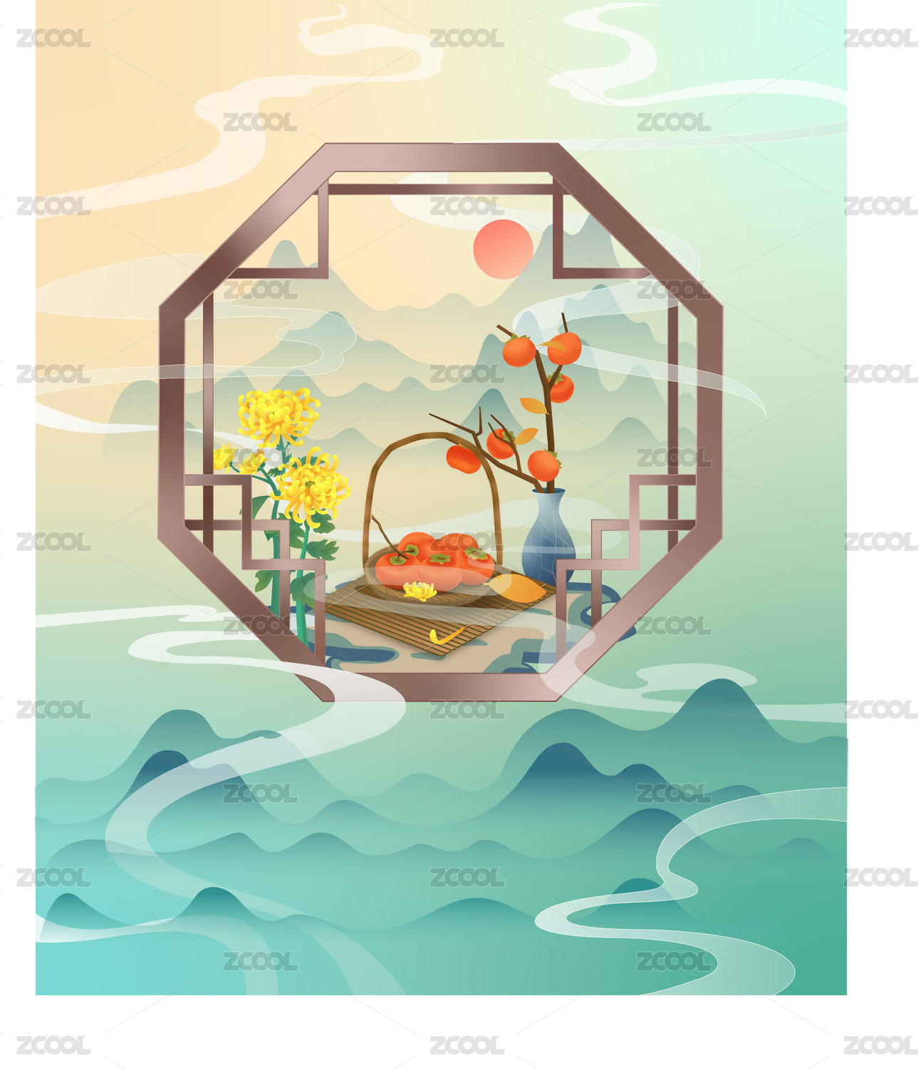 重阳节古亭菊花酒糕点元素矢量插画
