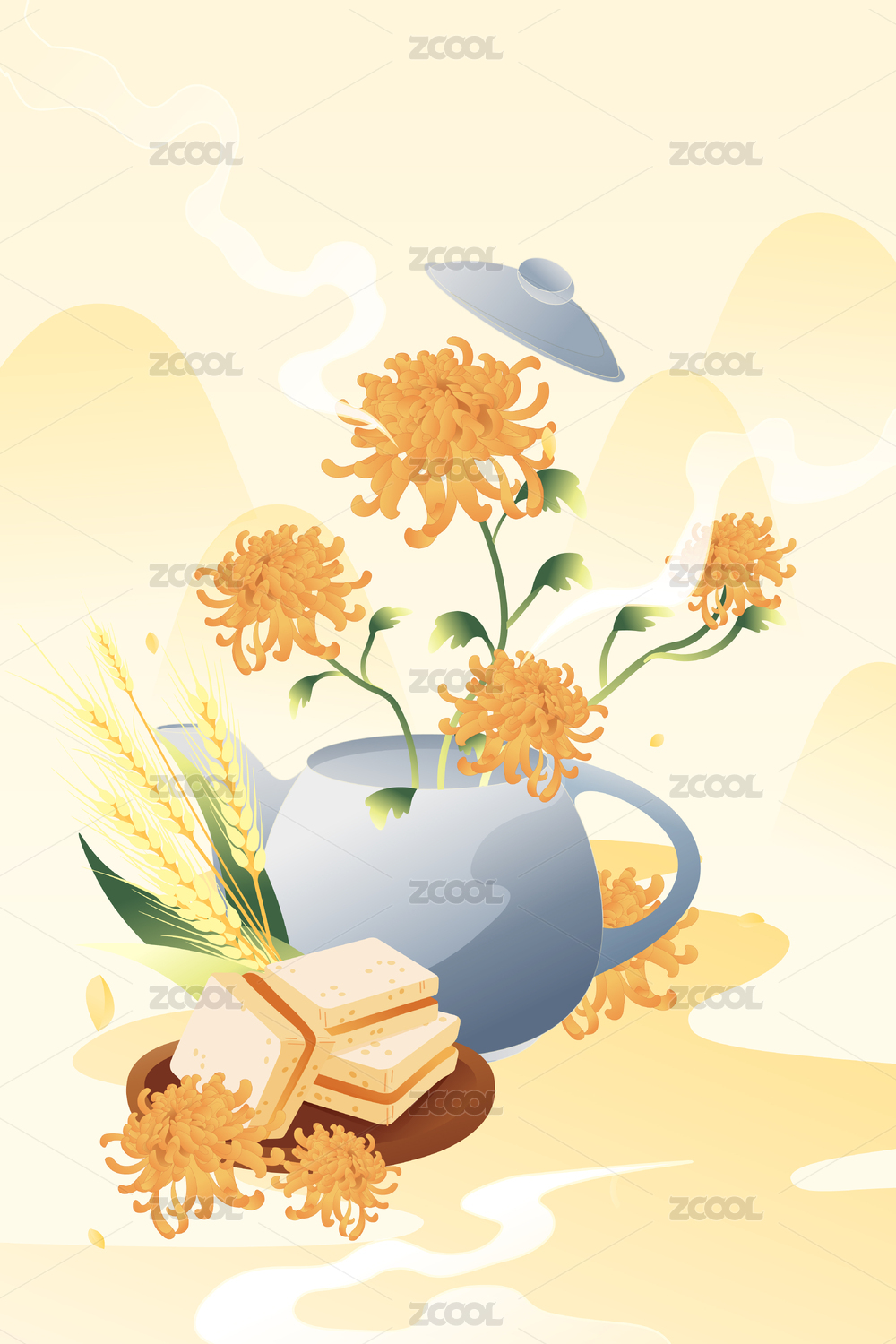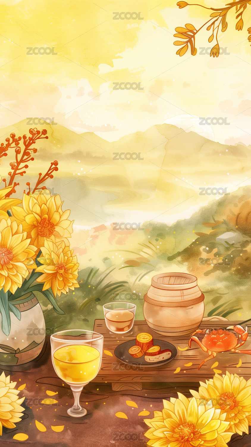 重阳节菊花酒坛糕点插画
