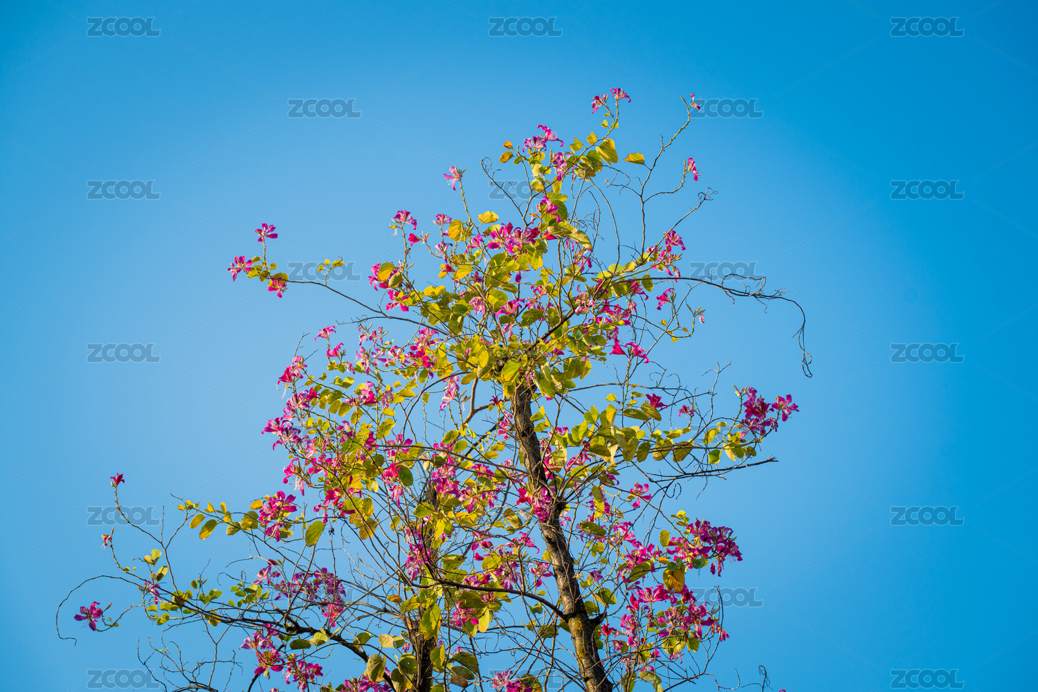 蓝天下的红花羊蹄甲花树