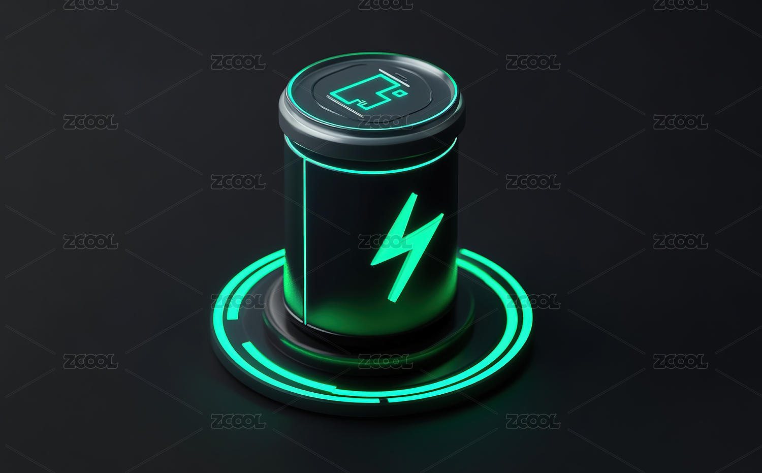 圆台上带黄色闪电标识的3D绿色能量电池
