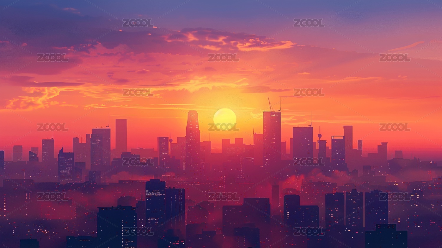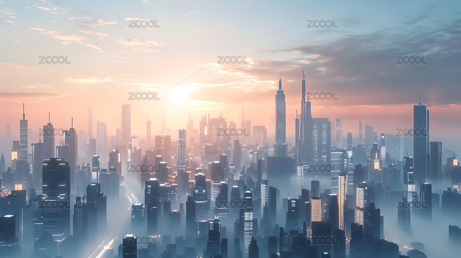 云雾缭绕的城市日落