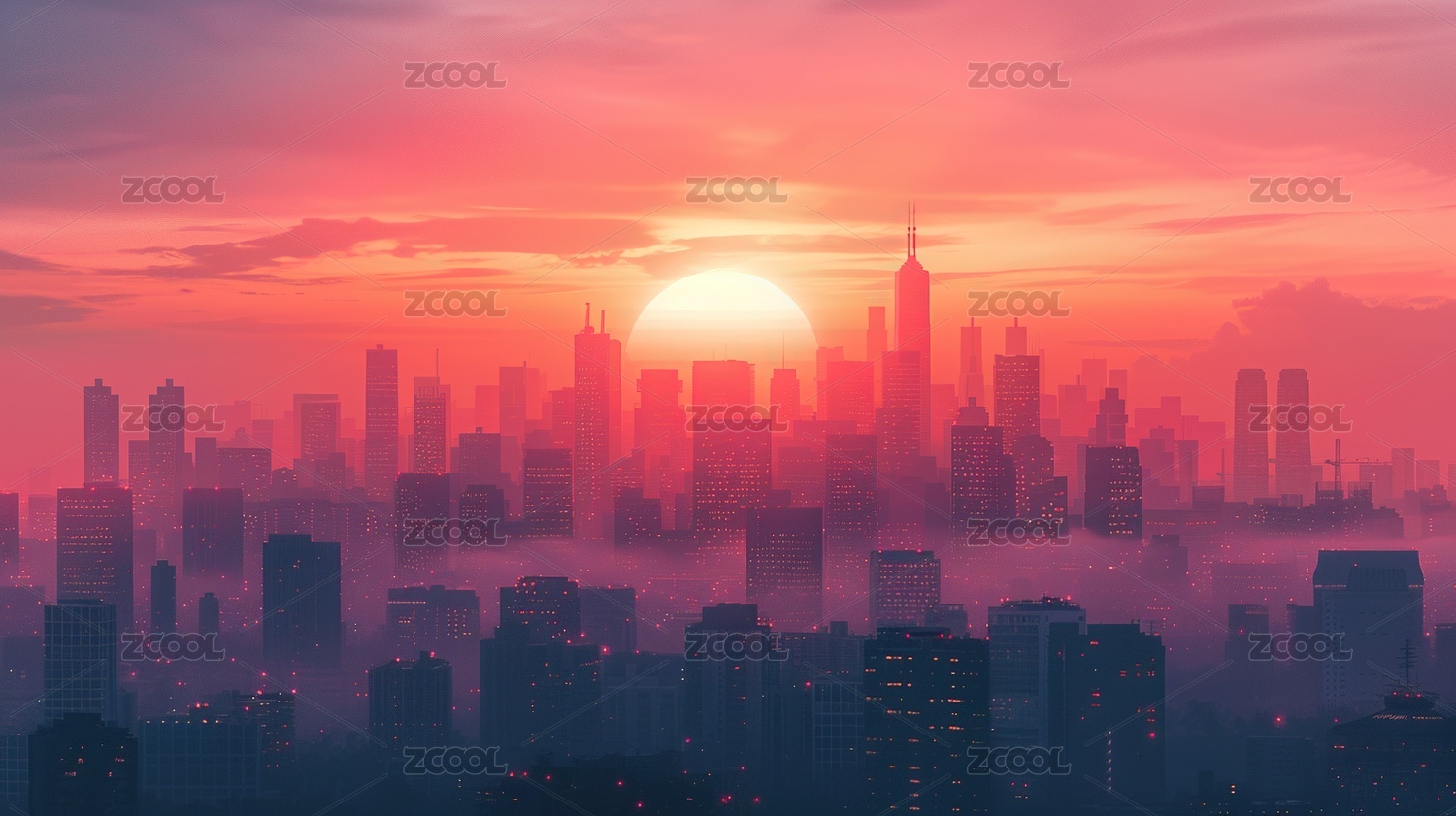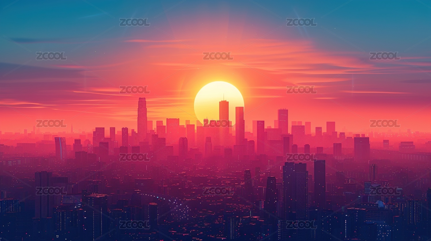 红色日出映衬未来城市天际线