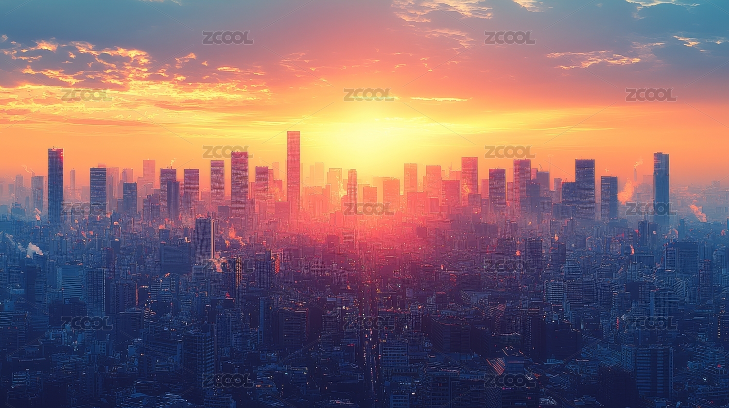 城市摩天大楼日落