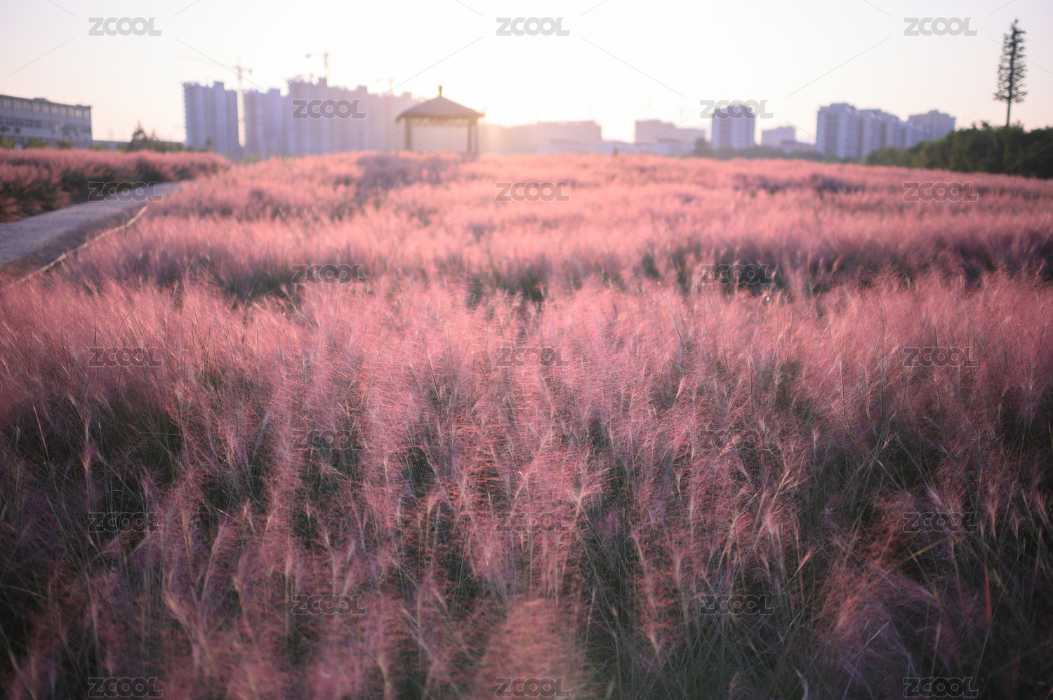 阳光照耀下城市街边公园里的粉黛乱子草花海