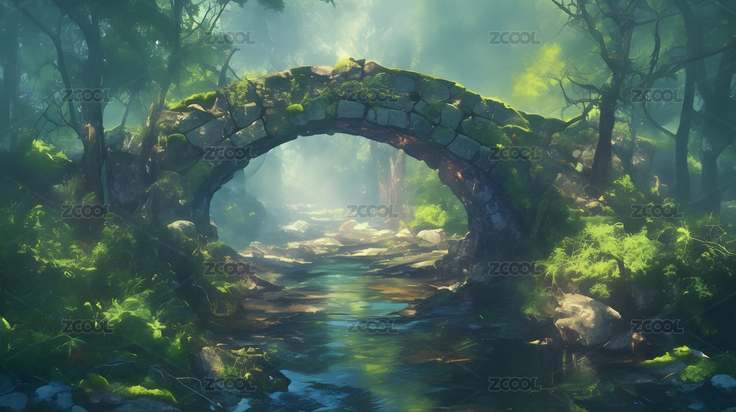 一座横跨在清澈溪流上的木制拱桥自然景观场