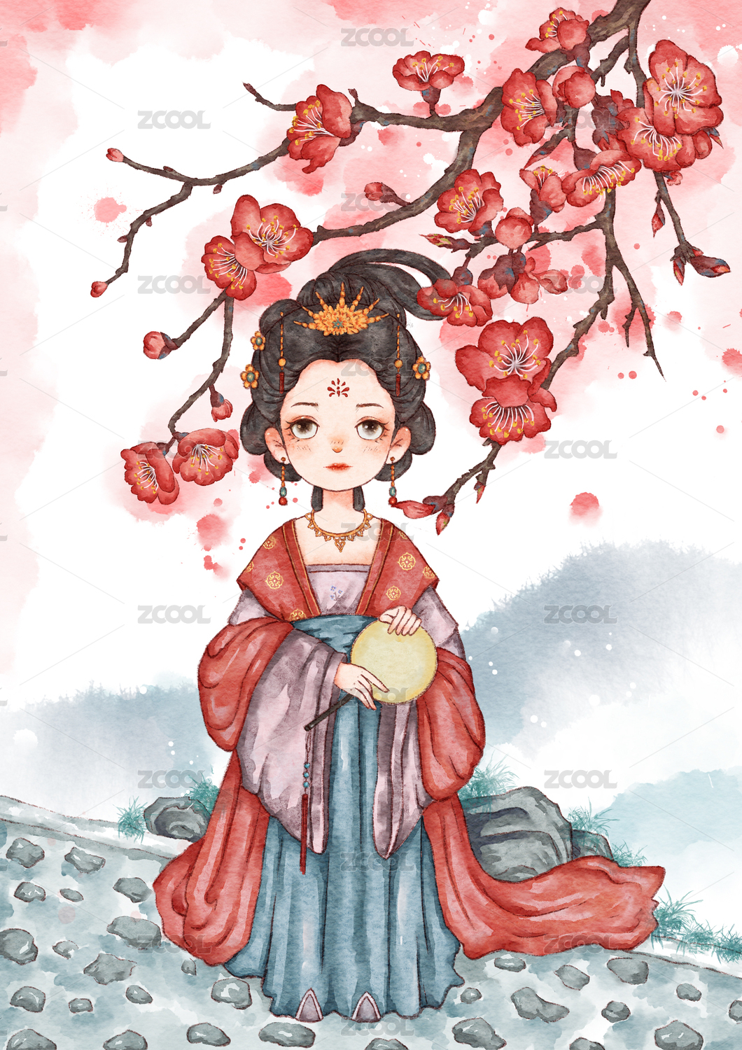Q版,古风,水彩,石榴,女孩,汉服,传统,中国风,手绘,花朵
