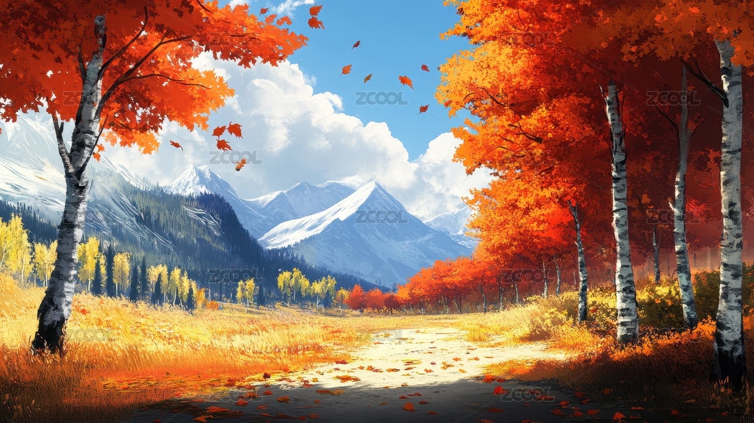 秋景,树林,小路,落叶,枫叶,金色,橙色,红色,水彩画,风景画