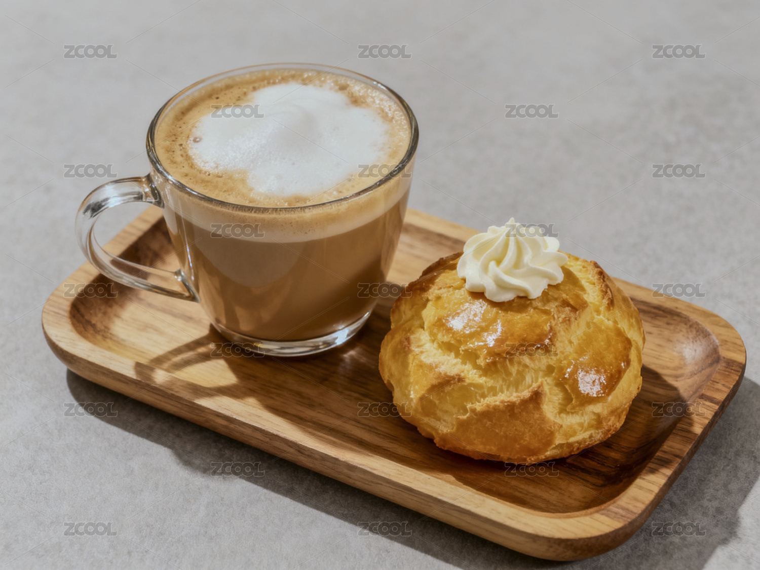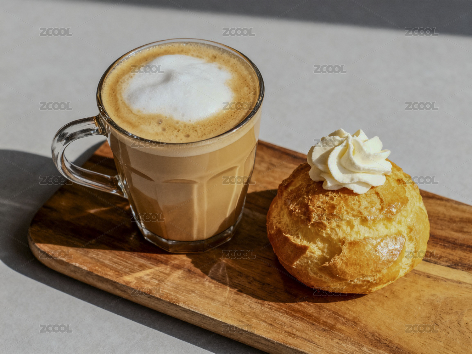 砧板上有一杯冰拿铁和一块千层切角蛋糕