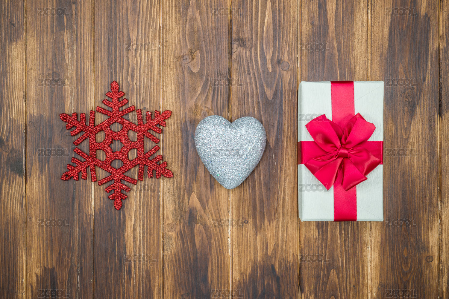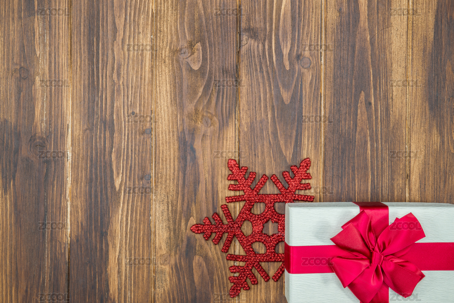 白色礼品红色丝绸包裹与雪花和星星形状的木制背景