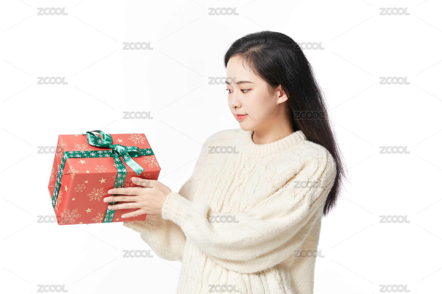 穿着红色喜庆毛衣的年轻女性拿着礼品盒