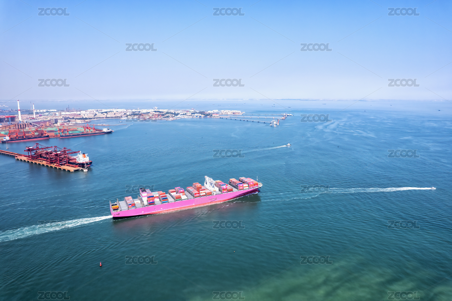 蓝天碧海映衬下的港口运输生产繁忙有序