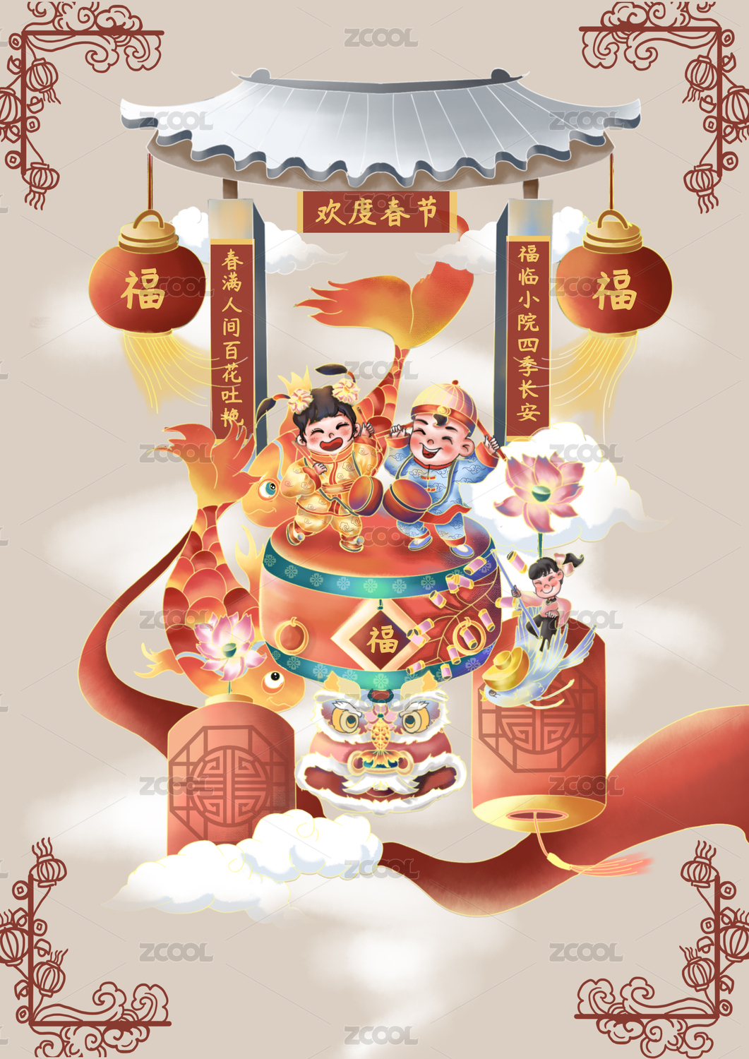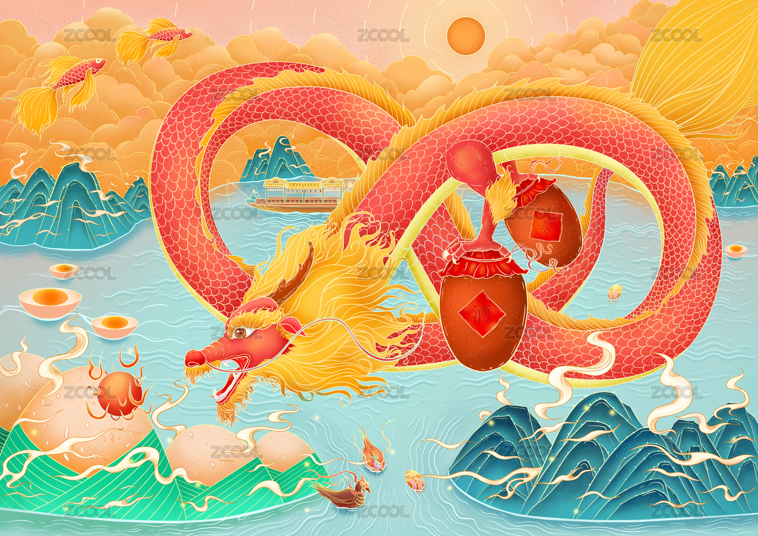 2020鼠年龙腾虎跃新中式喜庆元宵节插画