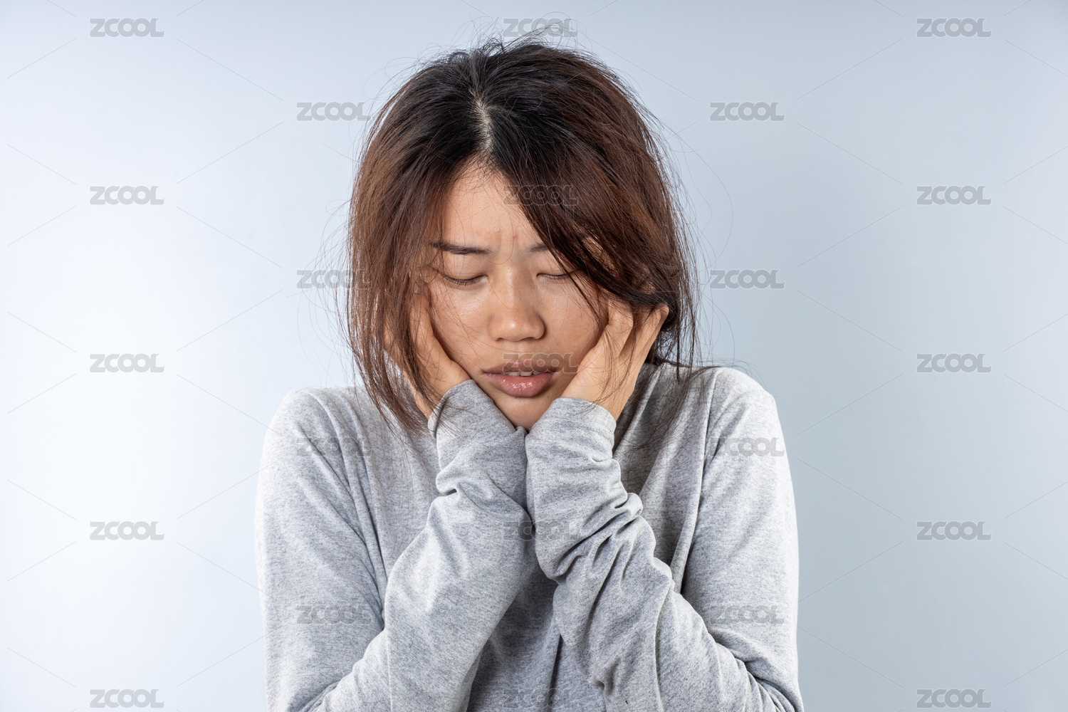 一个亚洲中国人摸着自己神经疼痛酸痛的牙周炎的牙齿