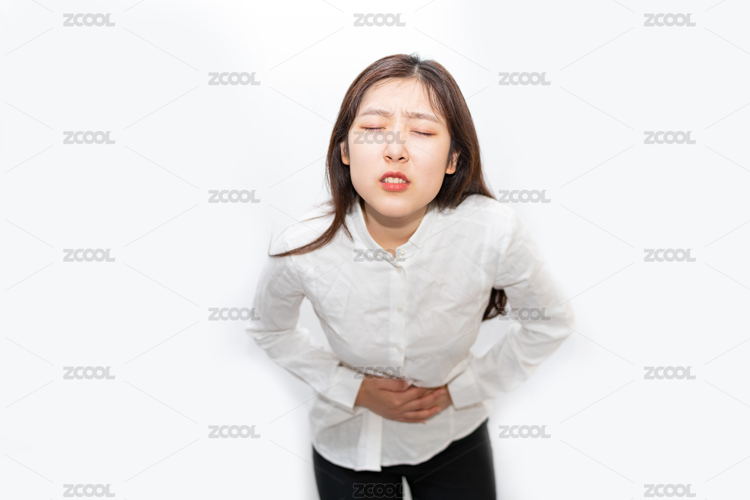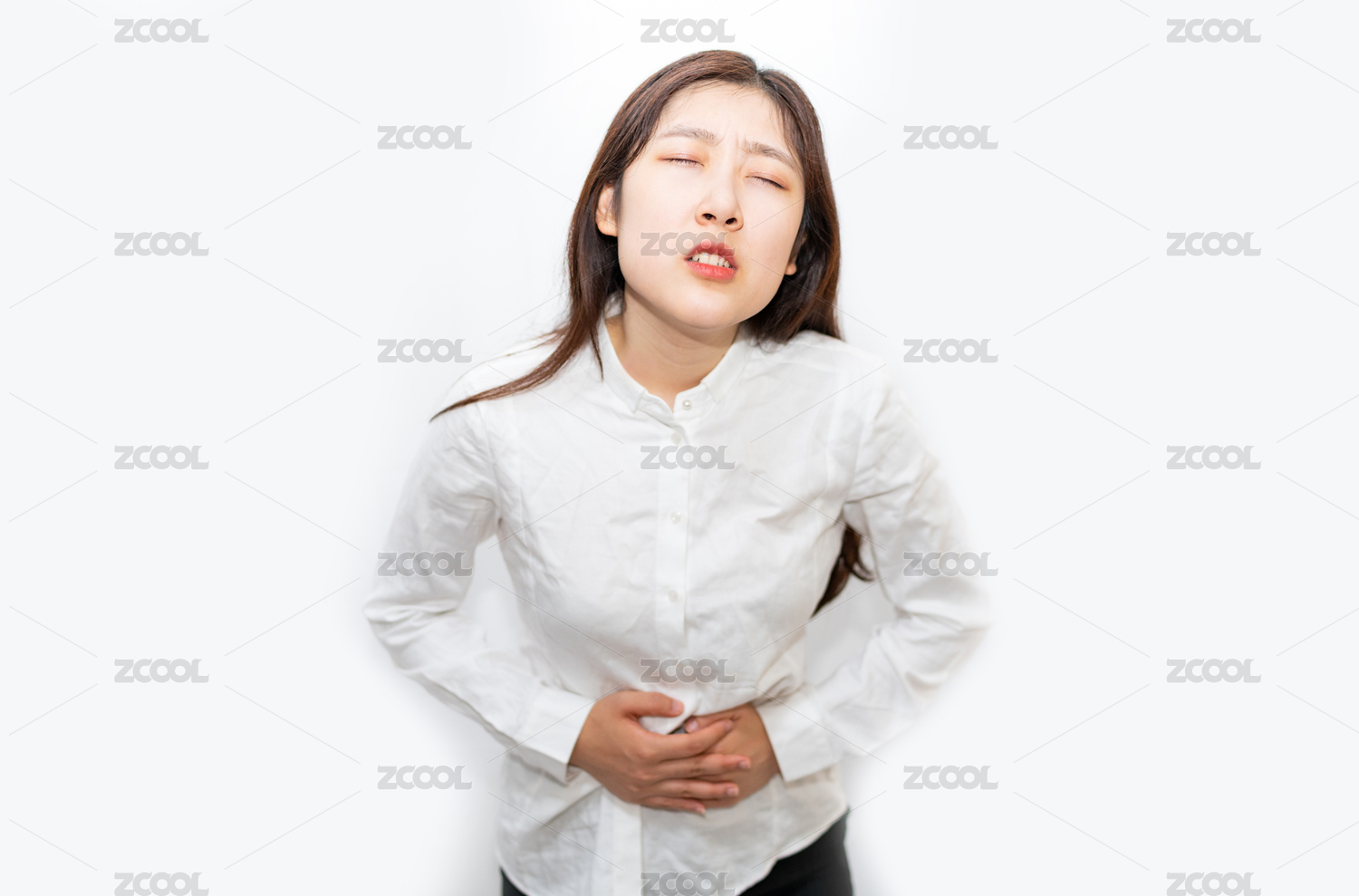 一个中国女人捂着自己疼痛的肚子做出痛苦的表情