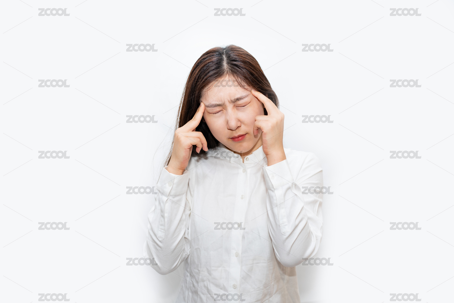 一个中国女白领上班族紧闭眼睛按摩着自己疼痛的头,无法忍受的头疼和头痛