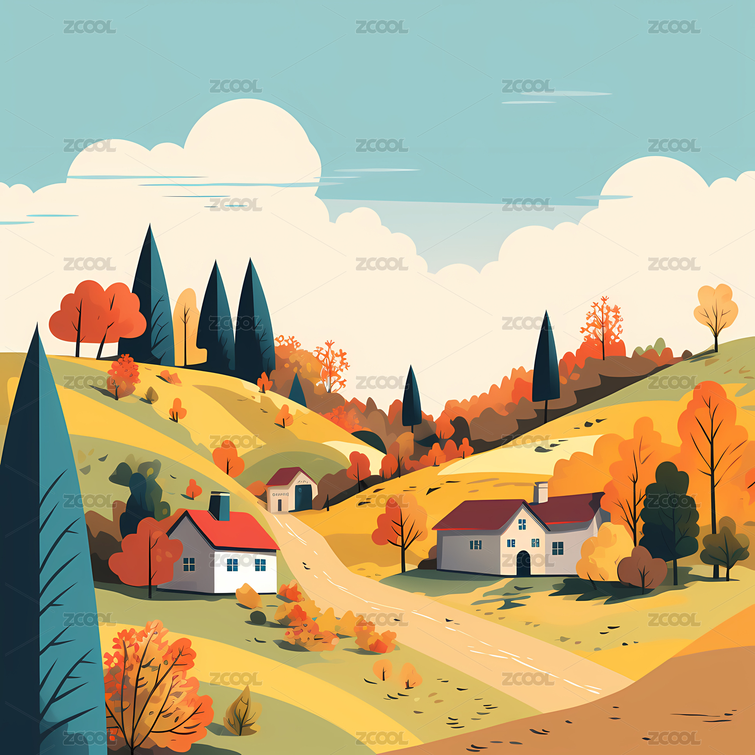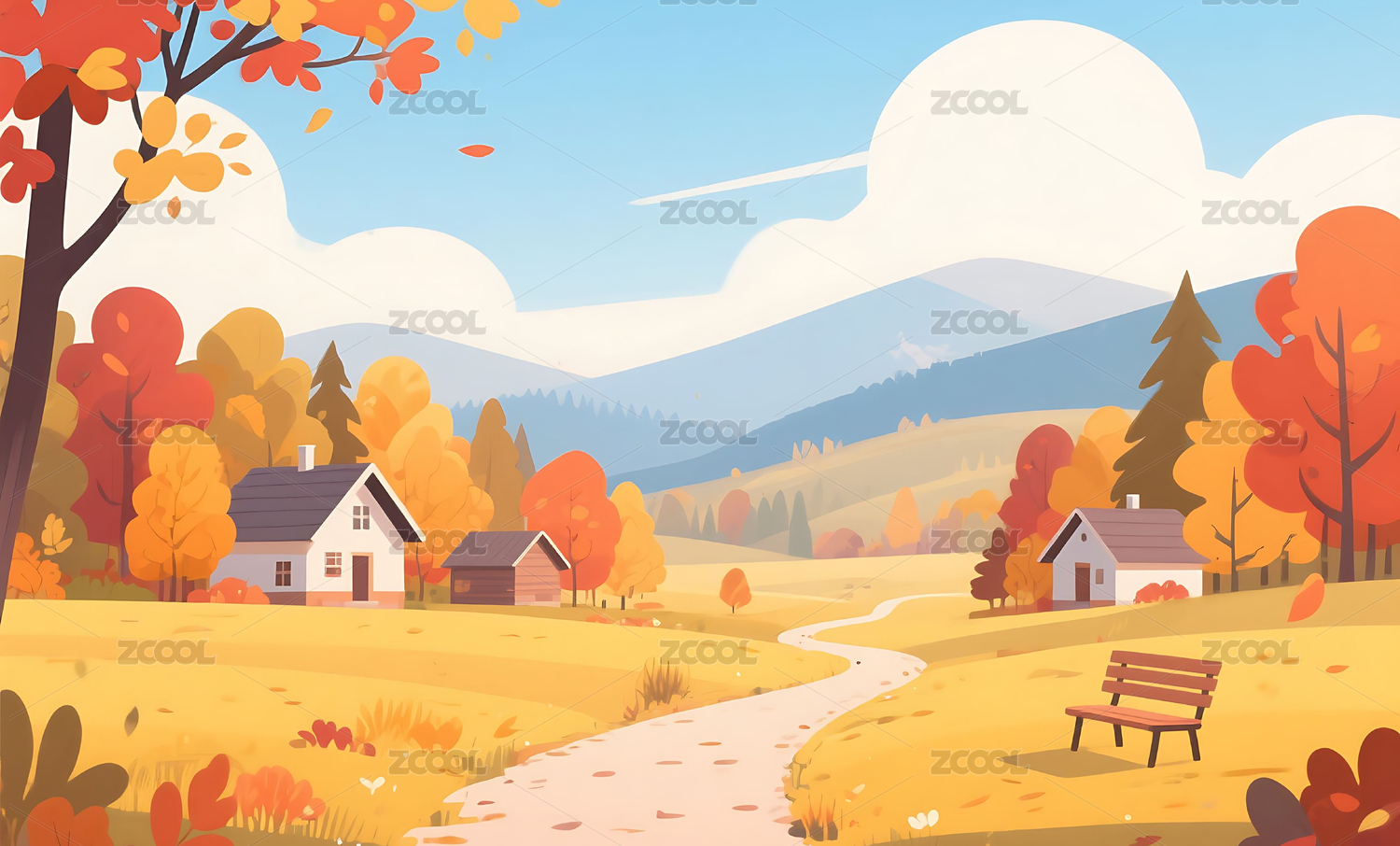 秋天乡村农村平面插画背景壁纸