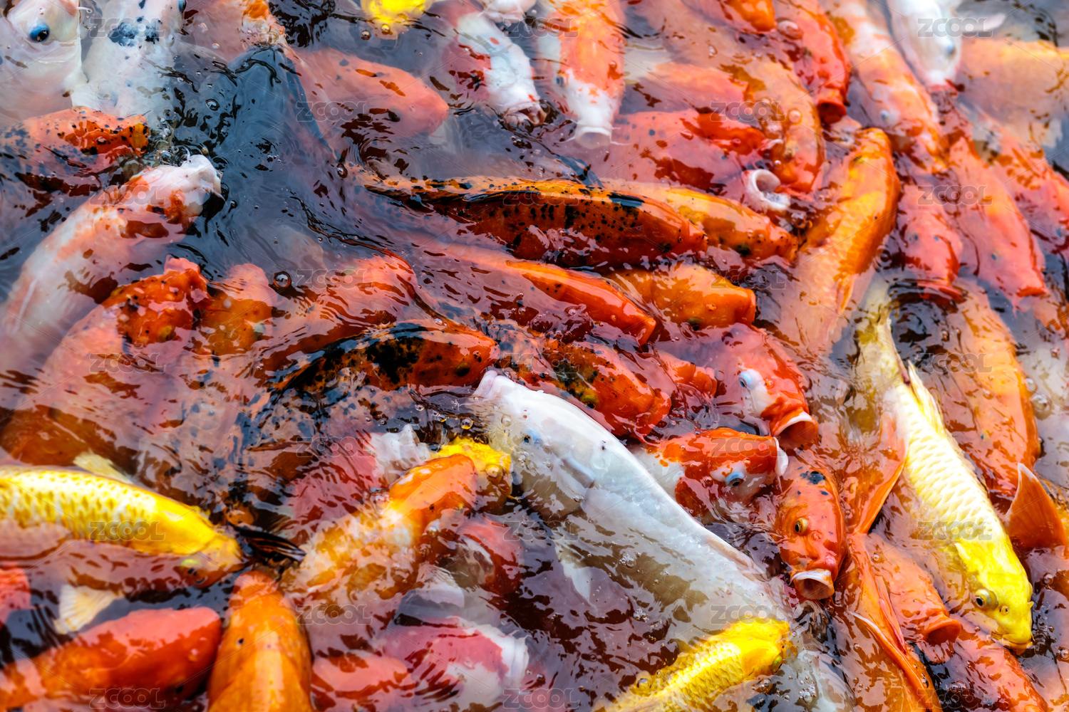 观赏鱼池里五颜六色的成群的锦鲤和金鱼