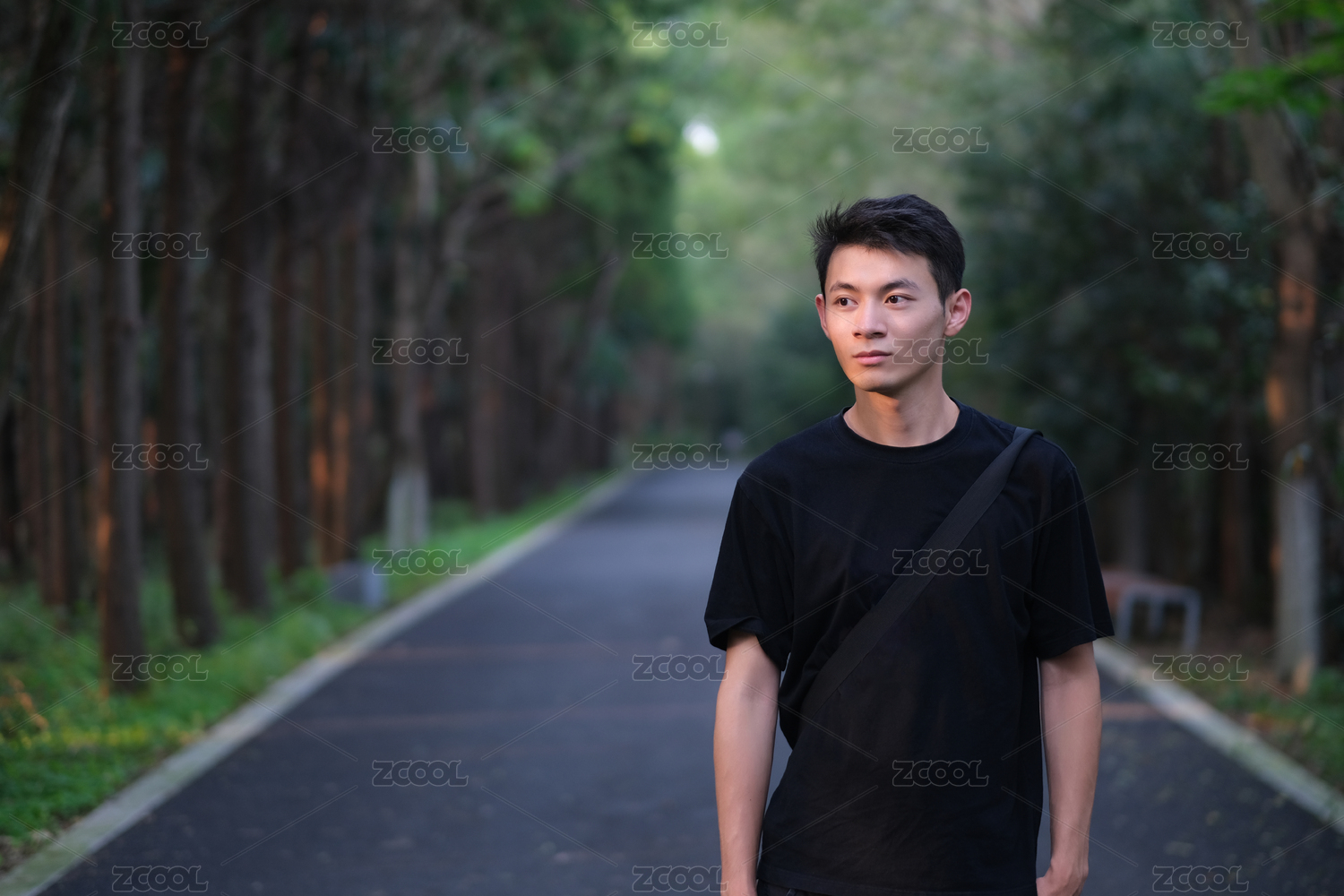 年轻帅气的中国男子在夏天户外公园的绿树前