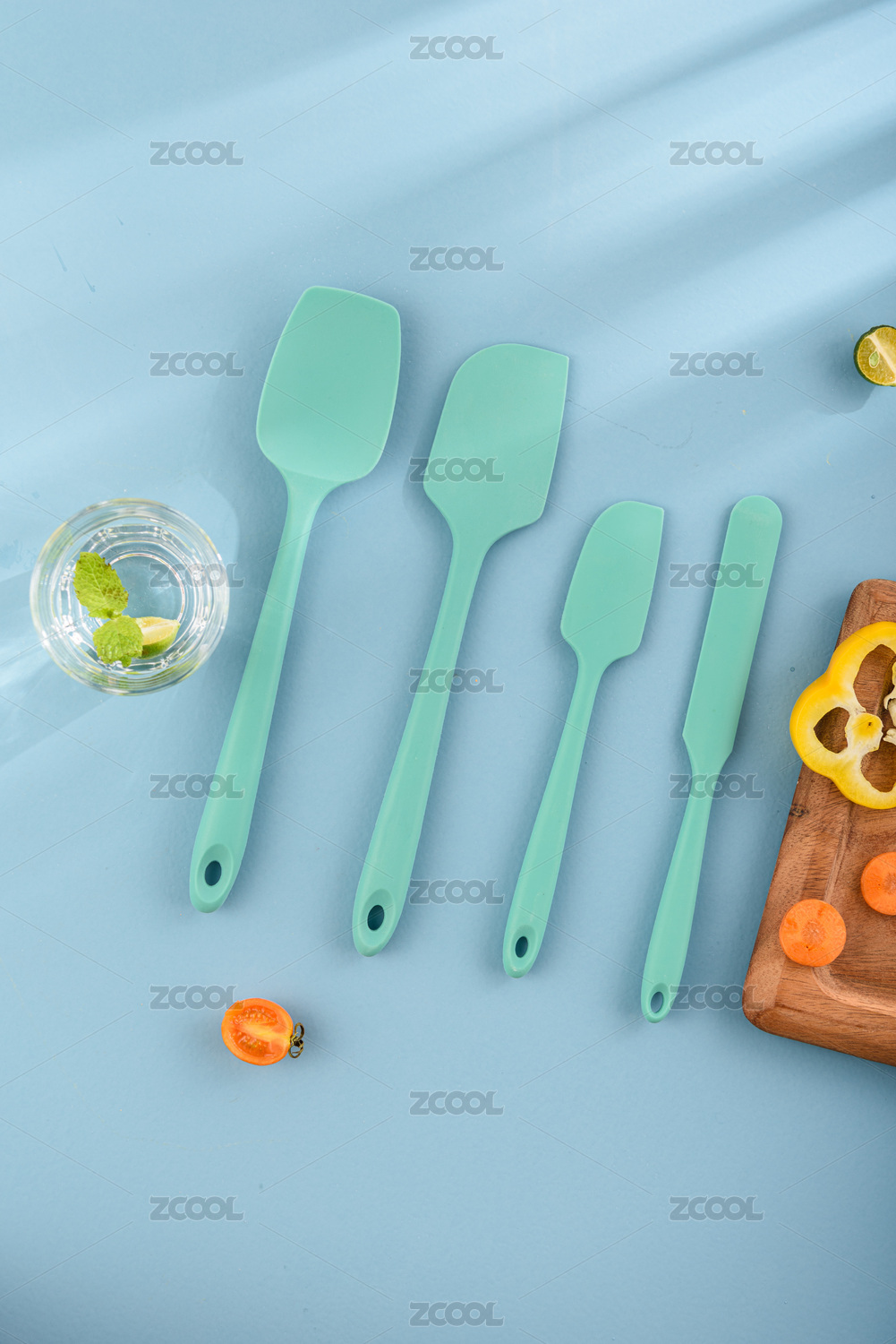 青绿色的硅胶刮刀四件套跟蓝色背景