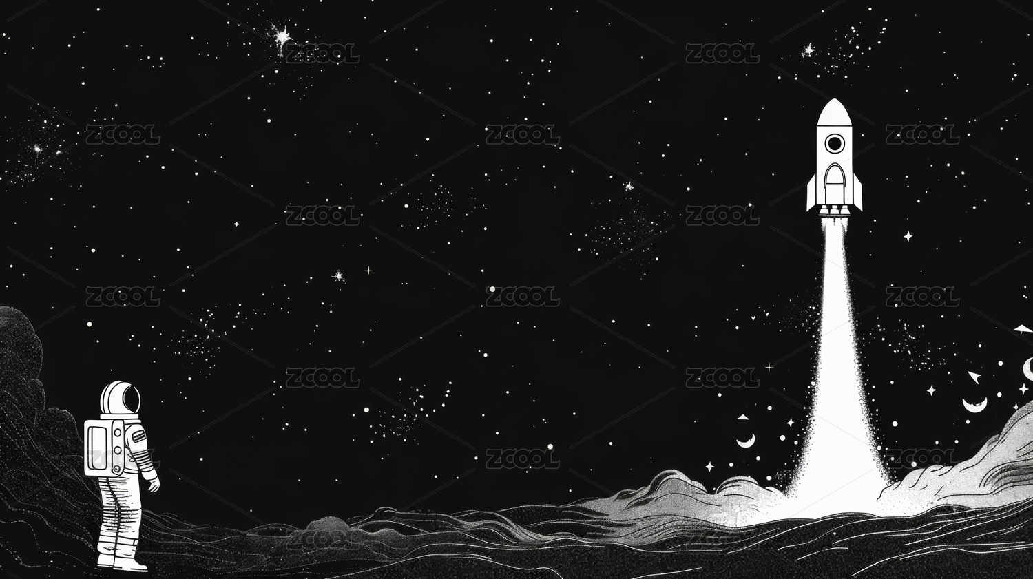 宇航员和飞船在太空中,黑白色宇宙卡通漫画