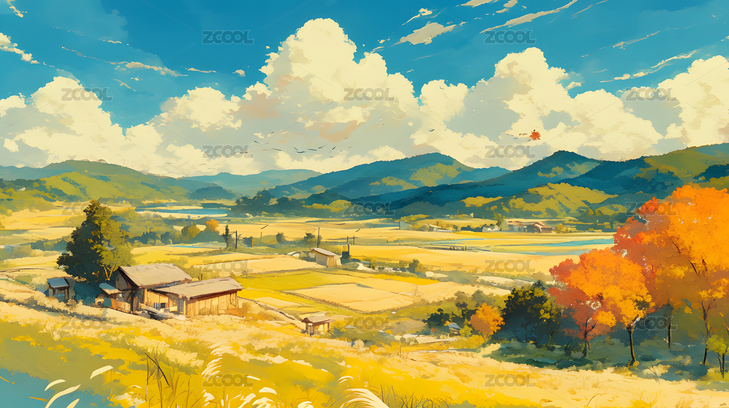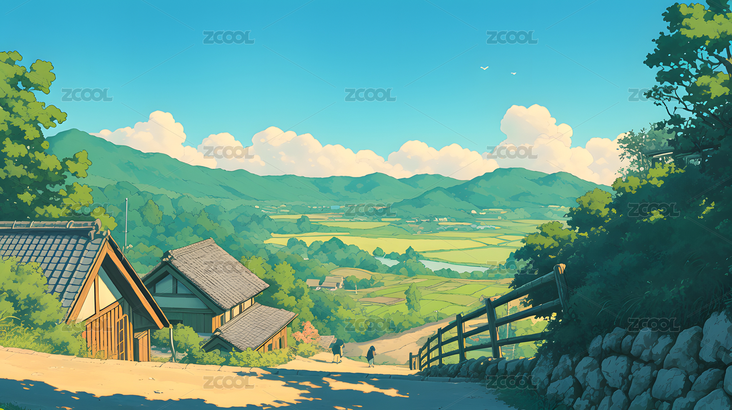 夏天户外旅行山峰房屋乡村风景蓝天白云插画