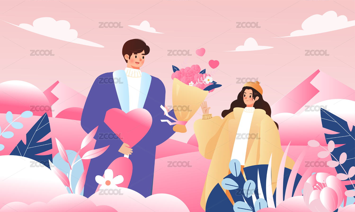 卡通西装男手持桃心向女孩表白示爱插画