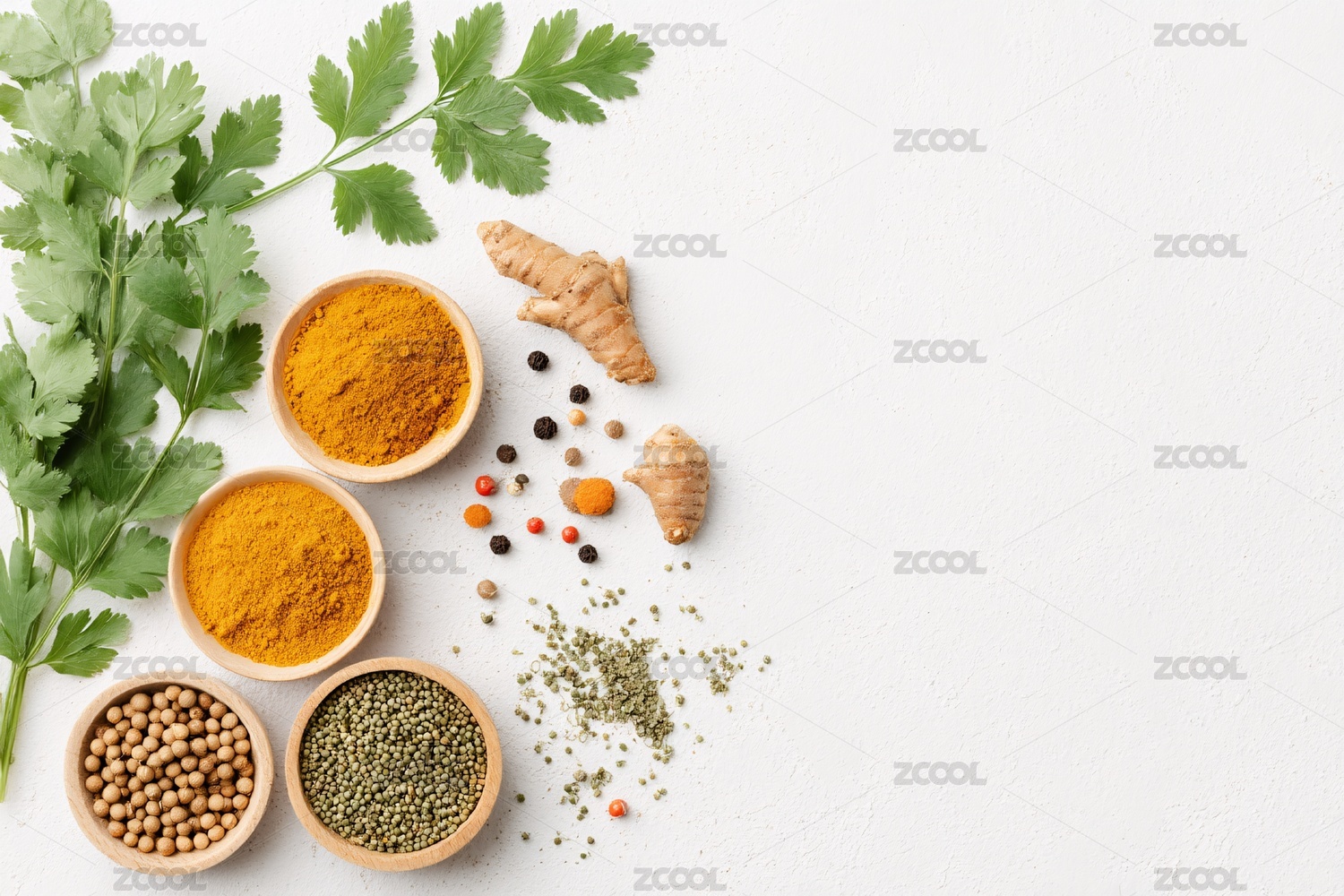 木碗中多样香料与绿叶摆拍