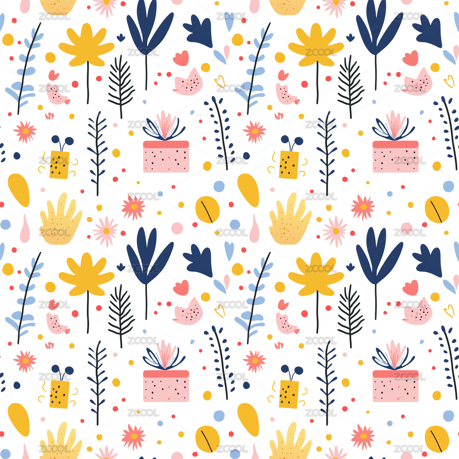 树叶与花朵无缝平铺四方连续纹样图案背景