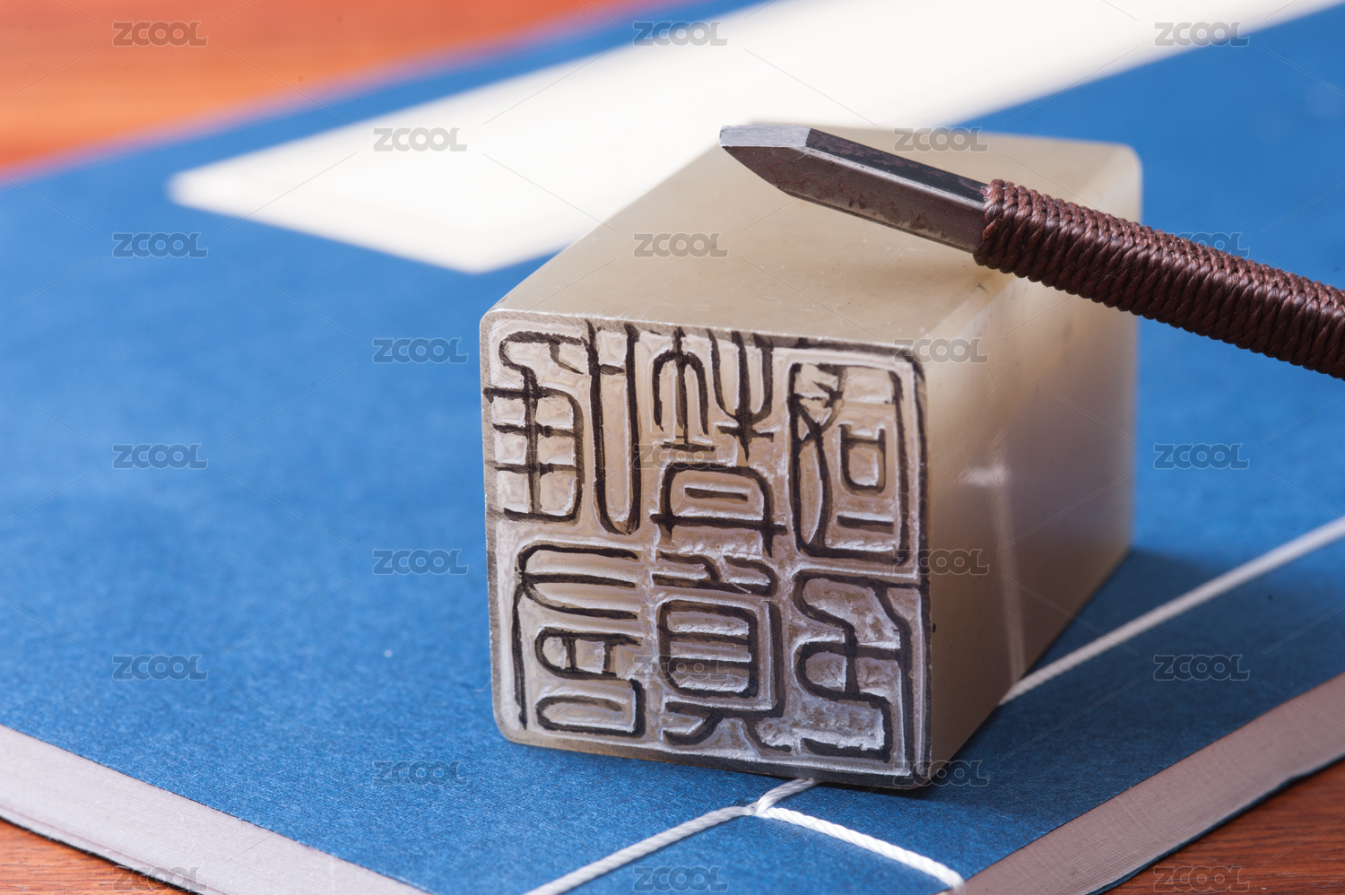 篆刻艺术印章刻刀印谱印泥摆放在桌面上