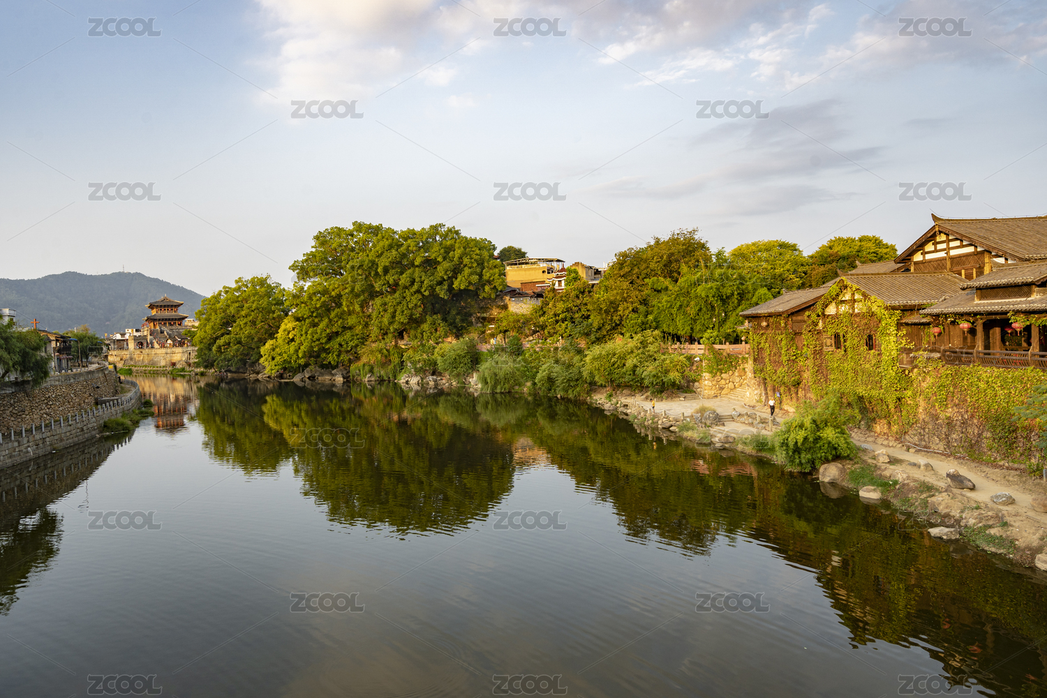 冬日暖阳下的汀江畔长汀古城木质仿古建筑