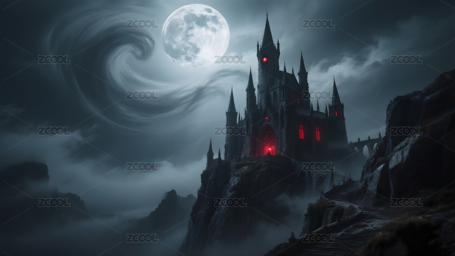 夜色中的哥特式大教堂尖顶与彩色玻璃窗