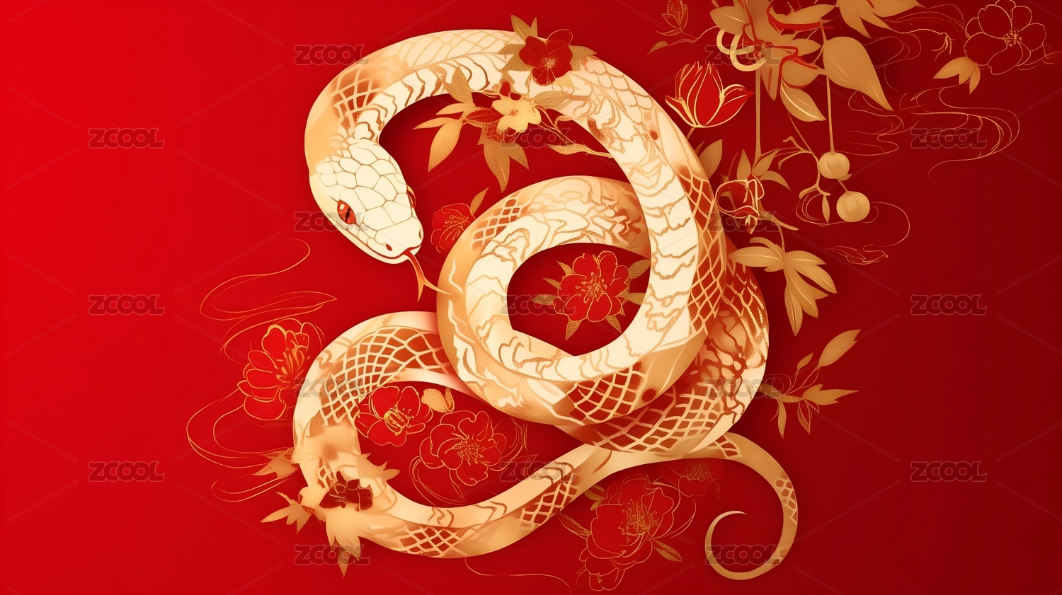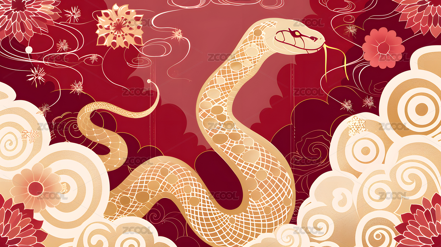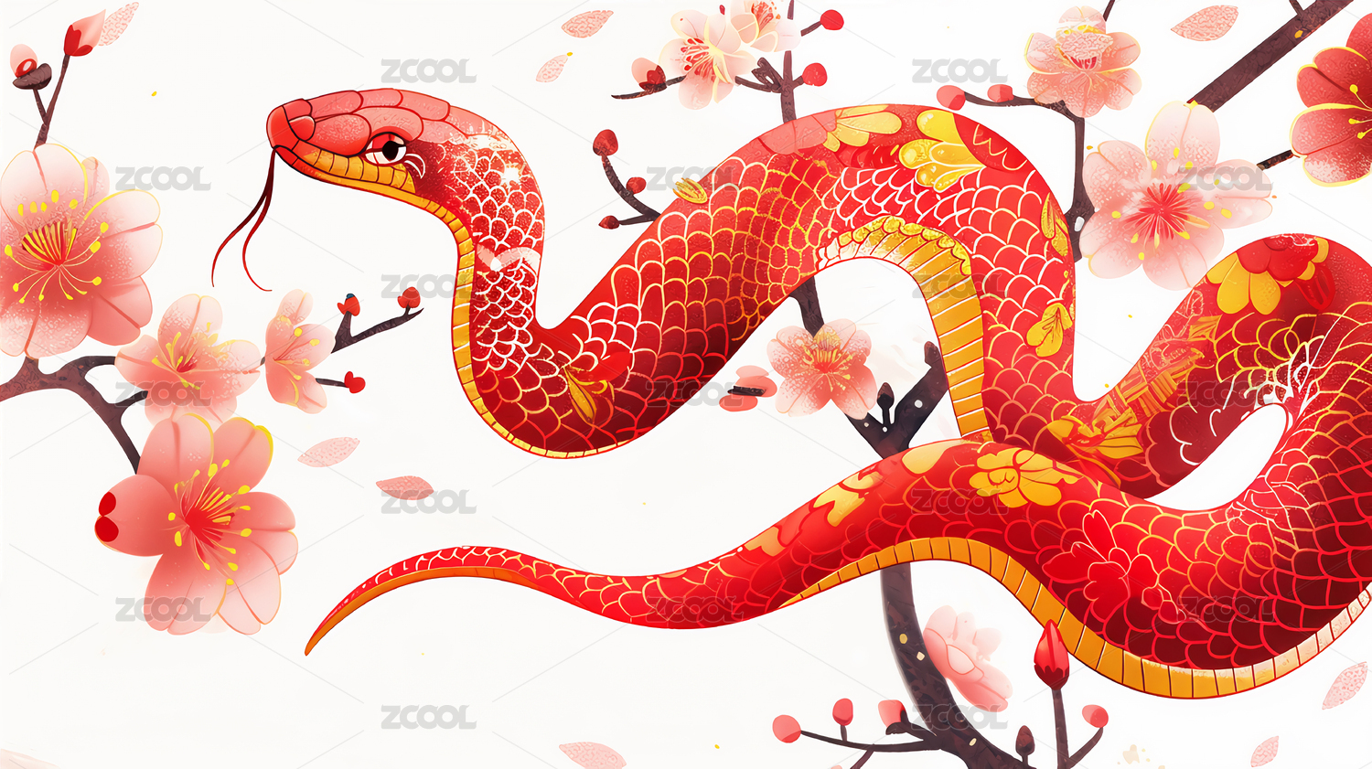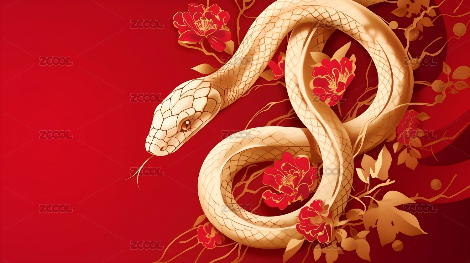 蛇年,金蛇,红花,插画,2025,蛇,卡通,新年,装饰
