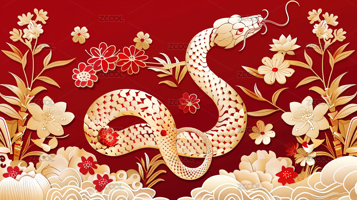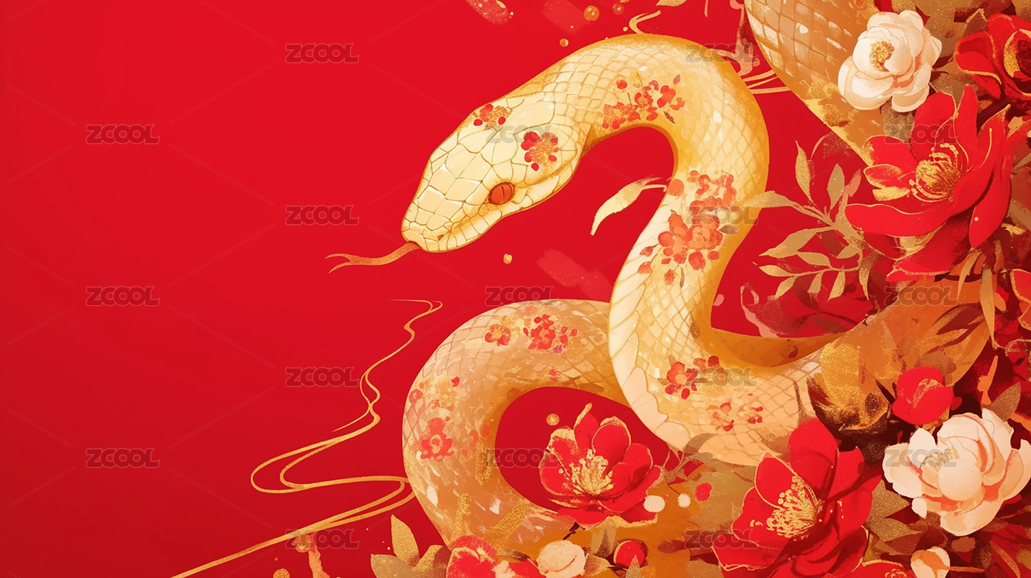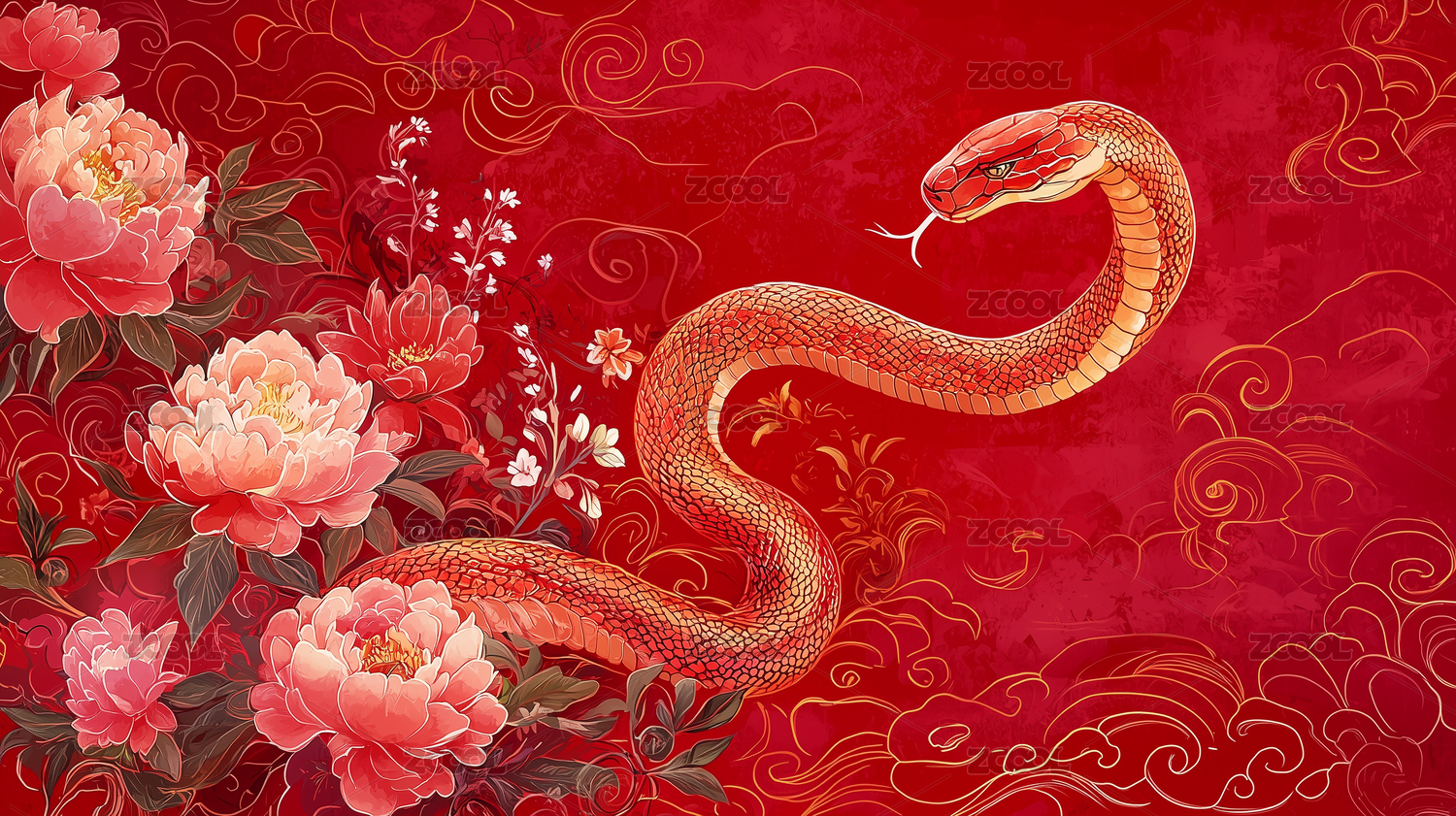 蛇年,金蛇,红花,插画,2025,蛇,卡通,新年,装饰