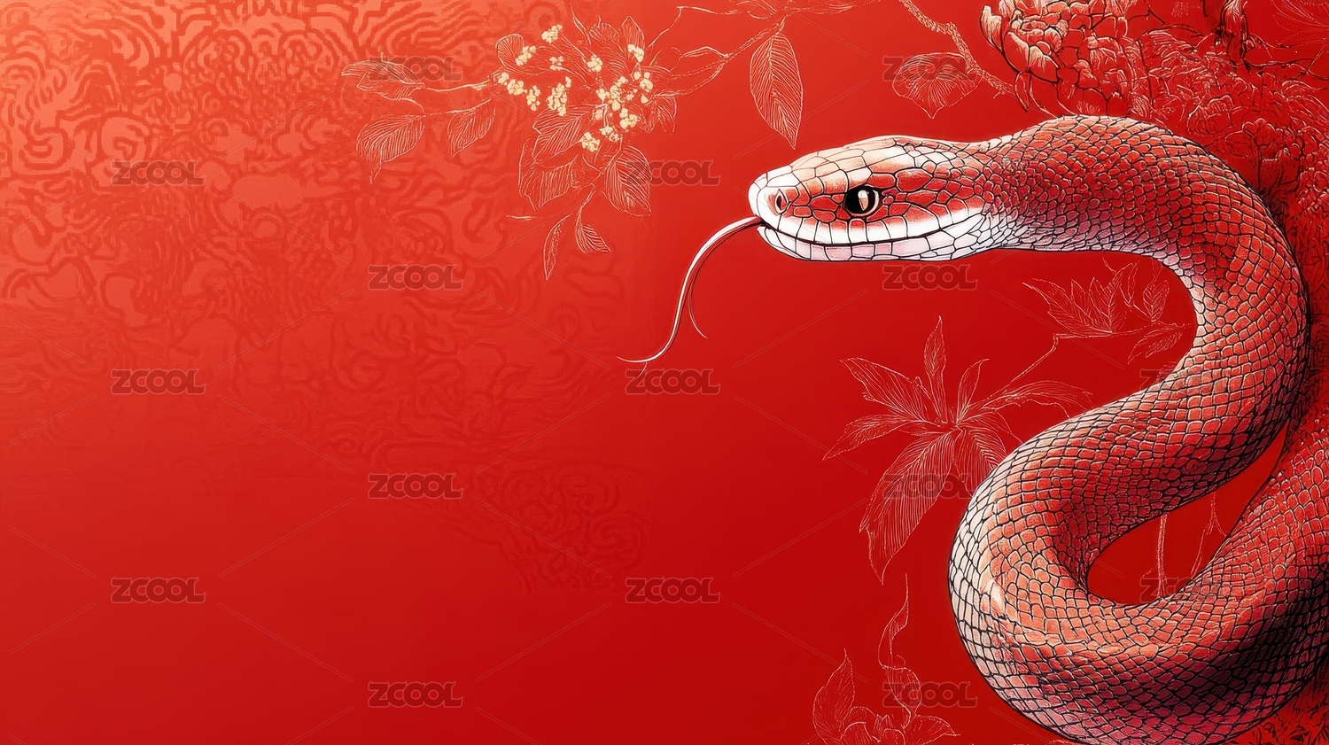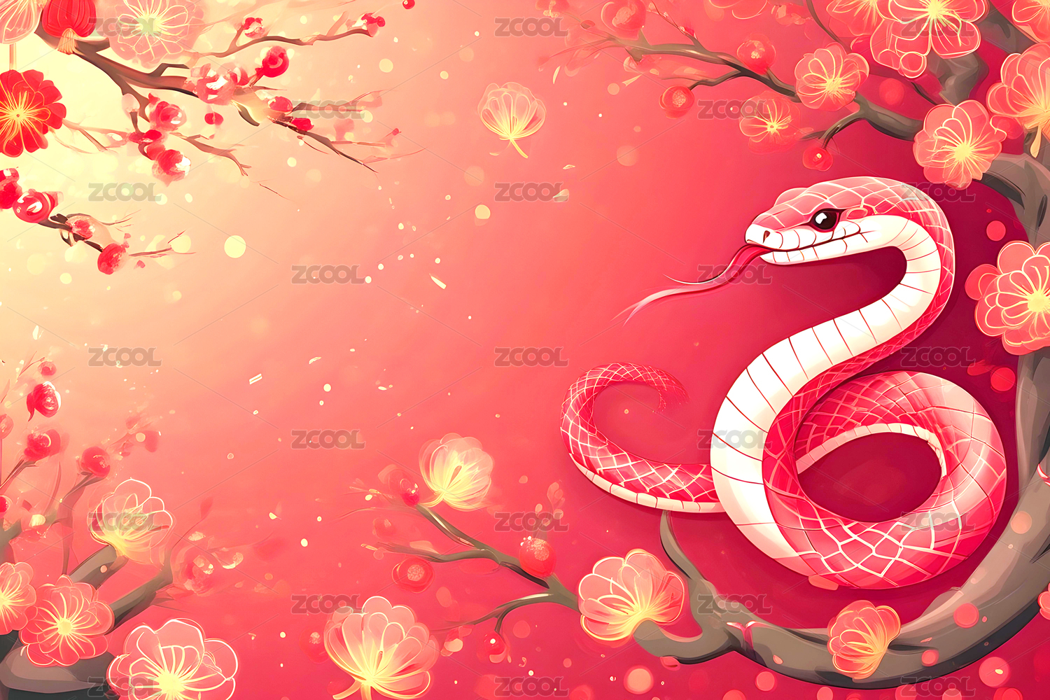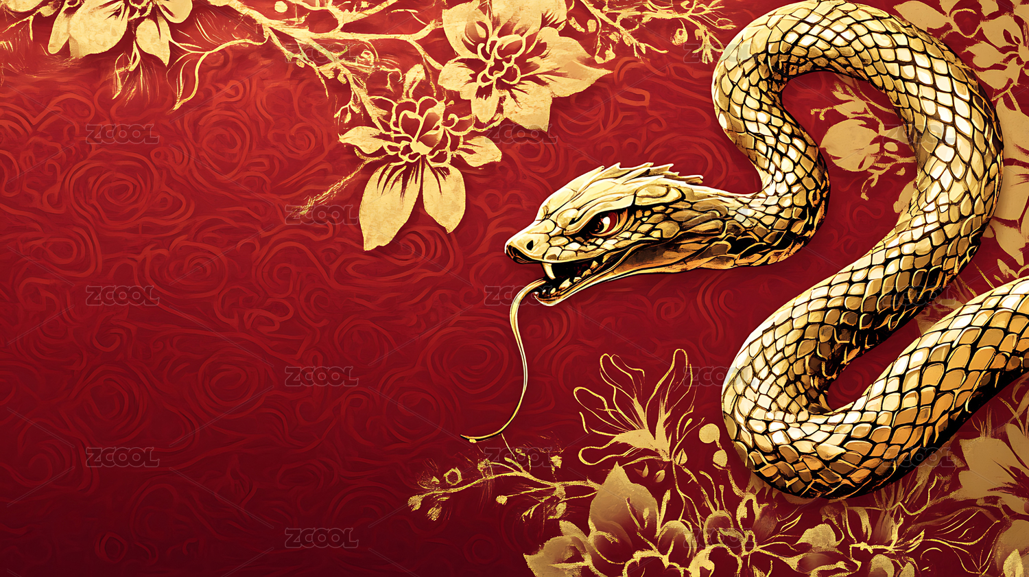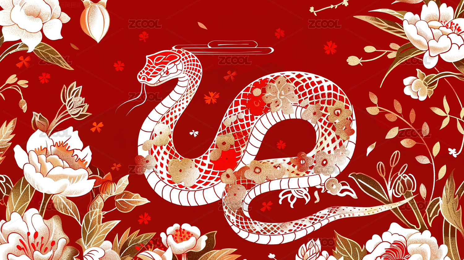蛇年,金蛇,红花,插画,2025,蛇,卡通,新年,装饰