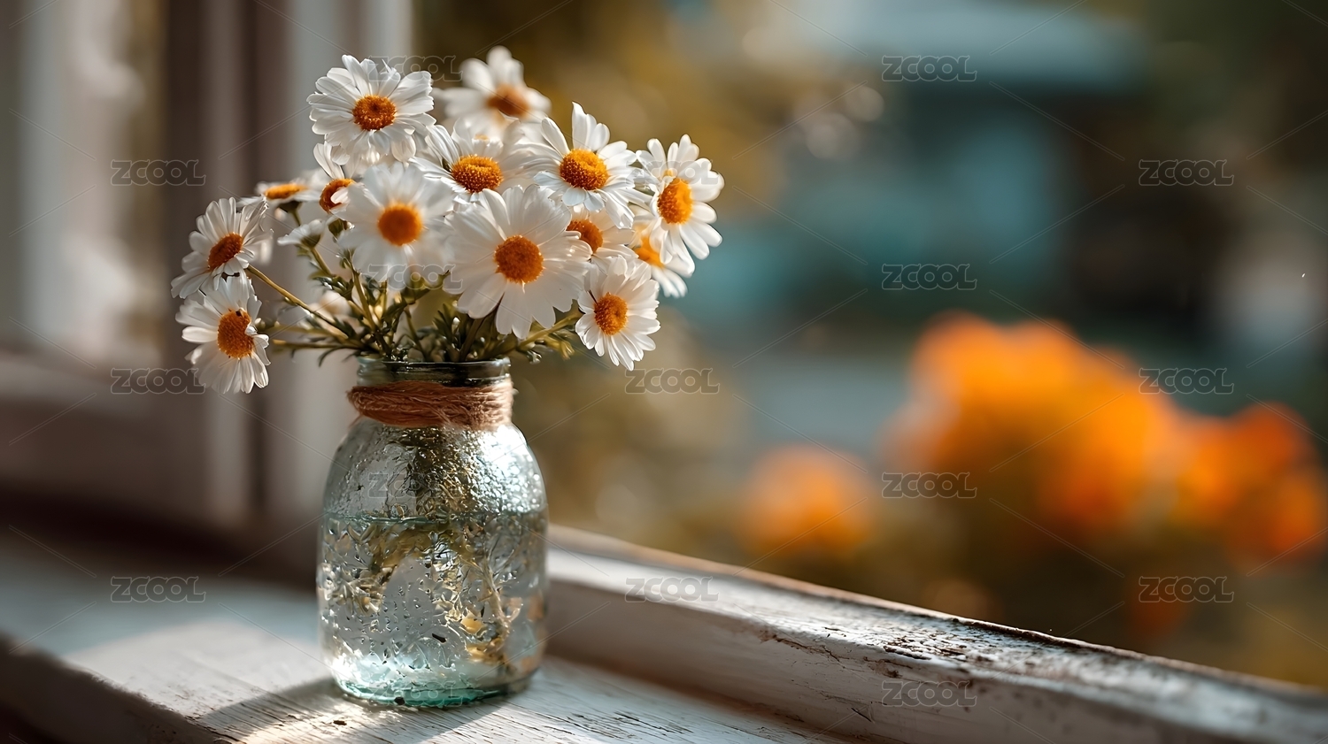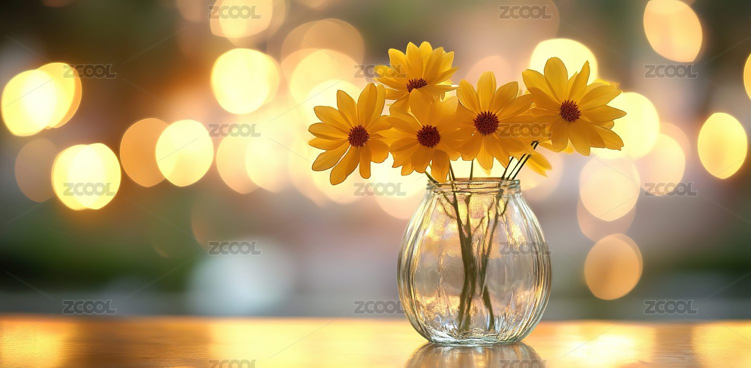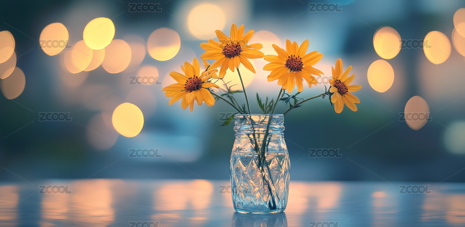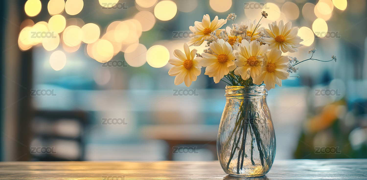 秋季深秋阳台上摆放着玻璃瓶里的金色花朵