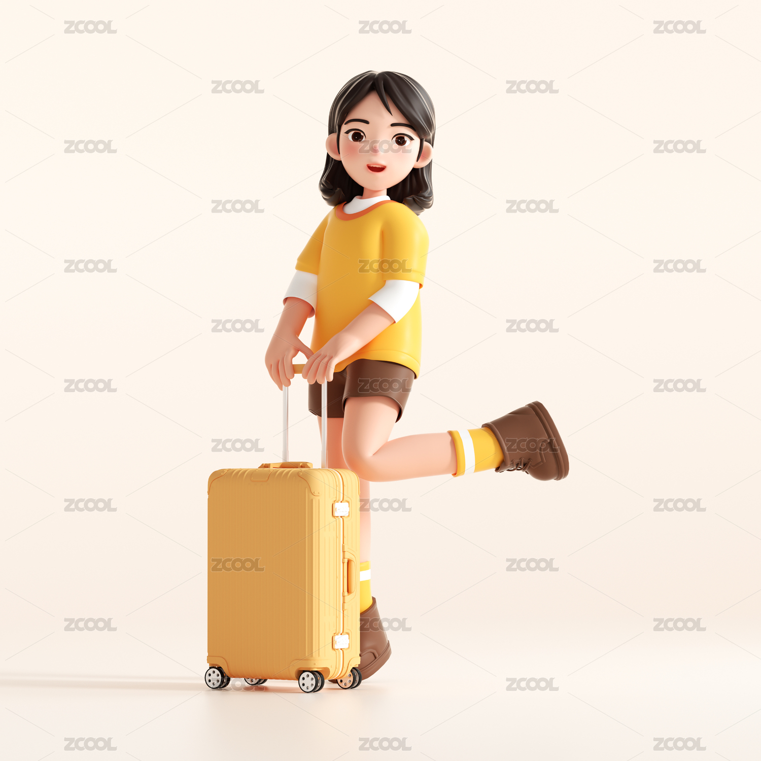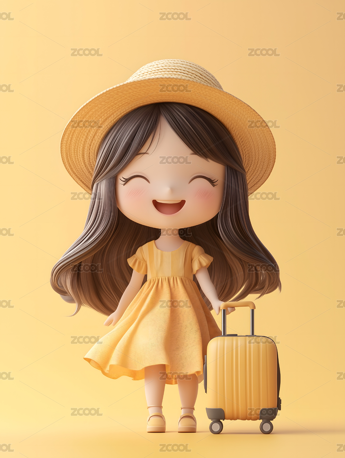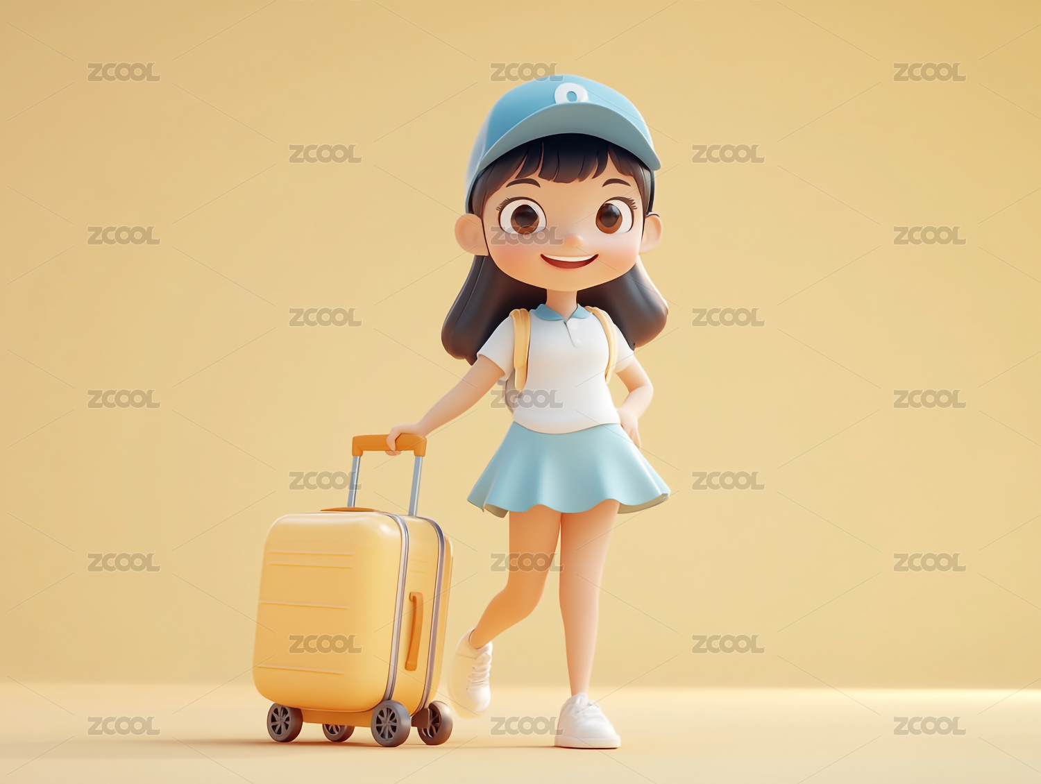 女孩,相机,行李箱,旅行,旅游,3d,卡通,单人,长发,裙子