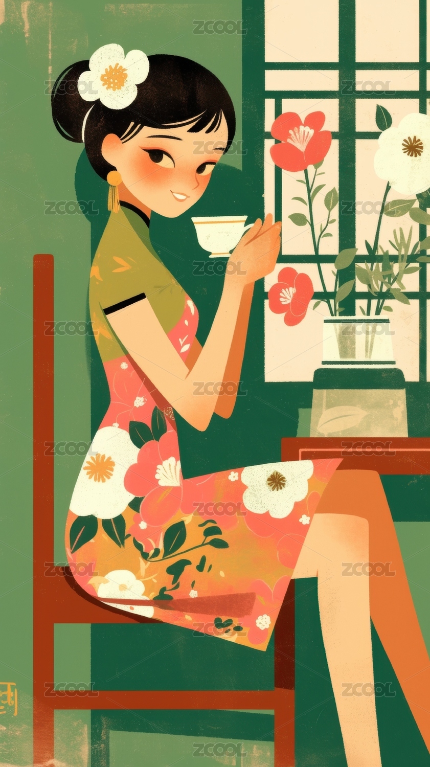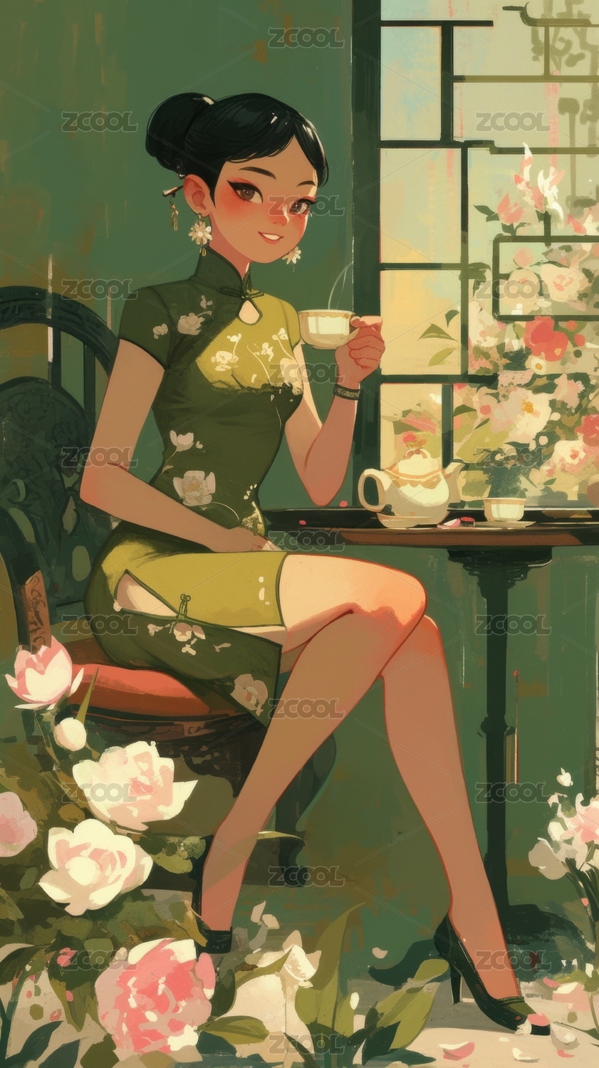 旗袍女子品茗图