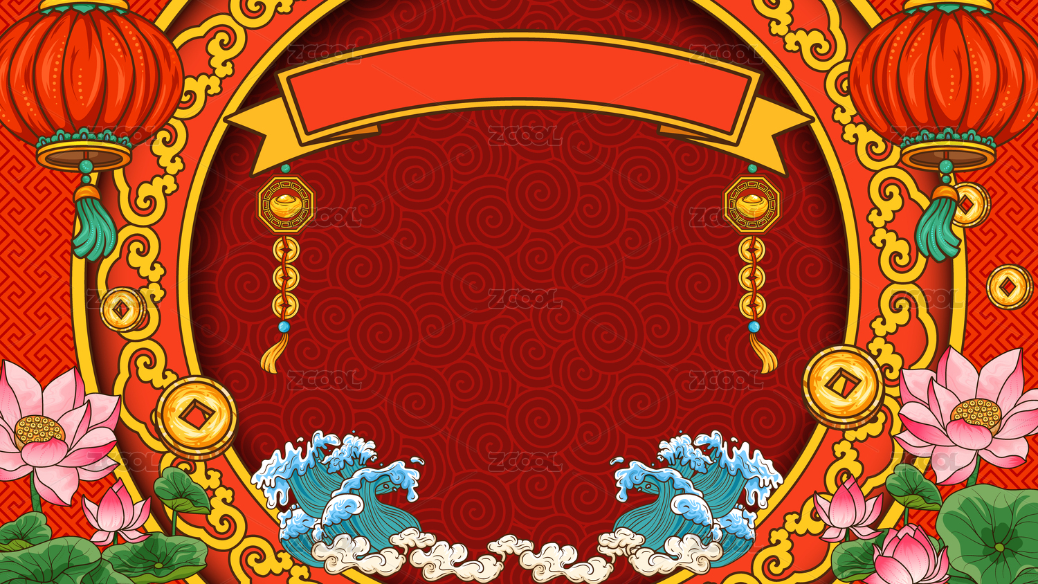 龙年,背景,锦鲤,红色,鲤鱼,灯笼,金币,元宝,财宝,荷花