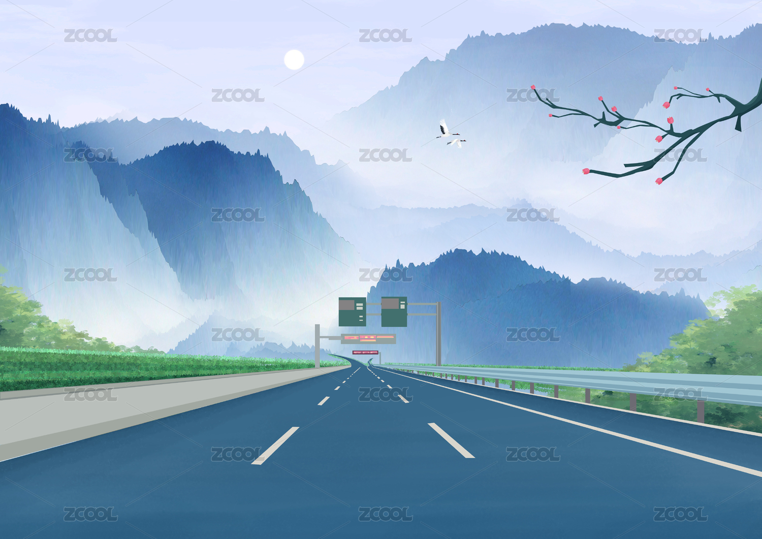 早晨山峰下的一条三车道高速公路中国风插画背景