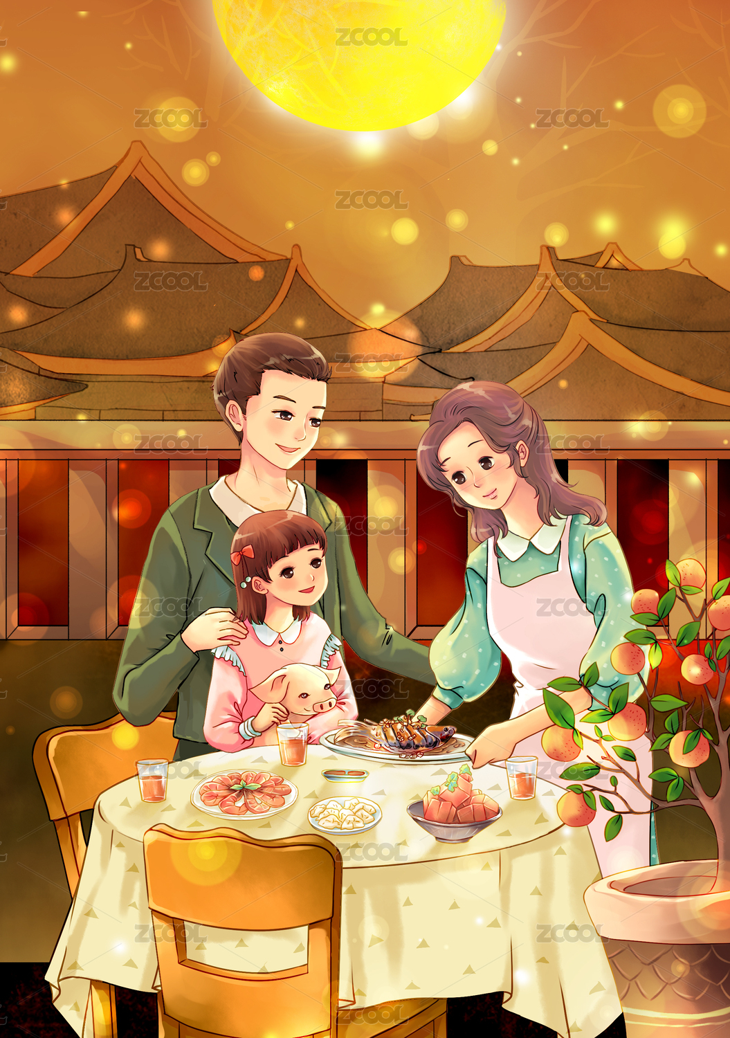 卡通2020鼠年新年春节家人年夜饭背景矢量插画