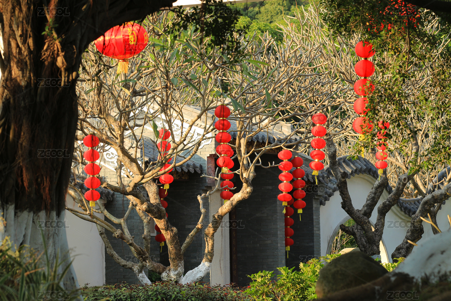 一串串大红灯笼高高挂在树上