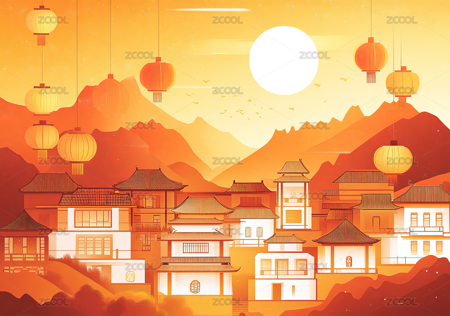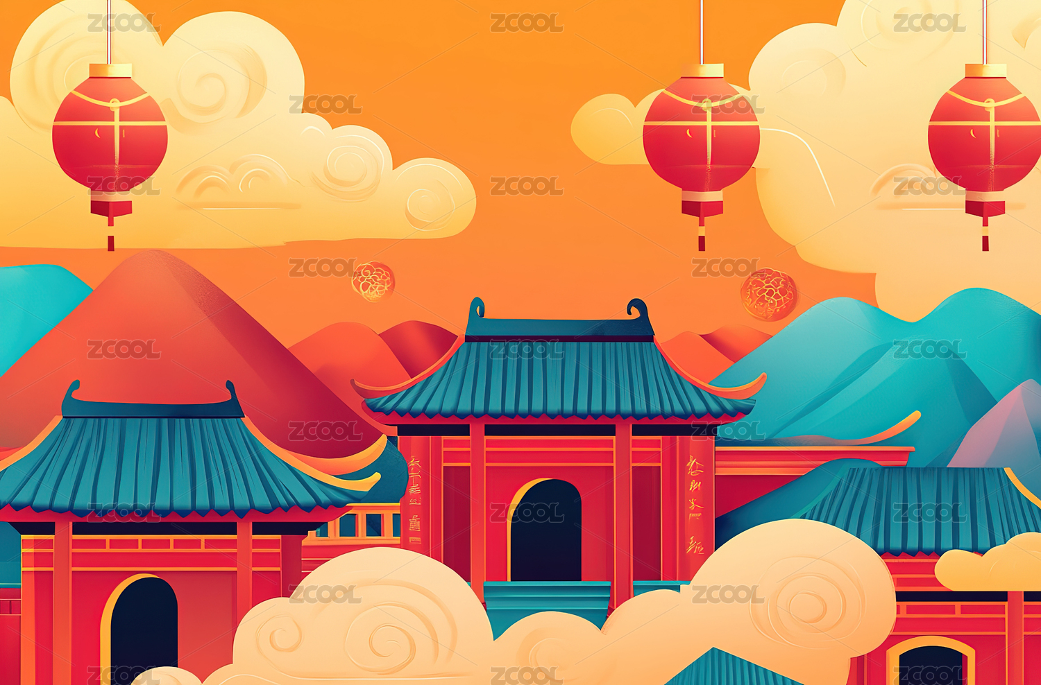 中国风卡通建筑喜庆节日氛围场景