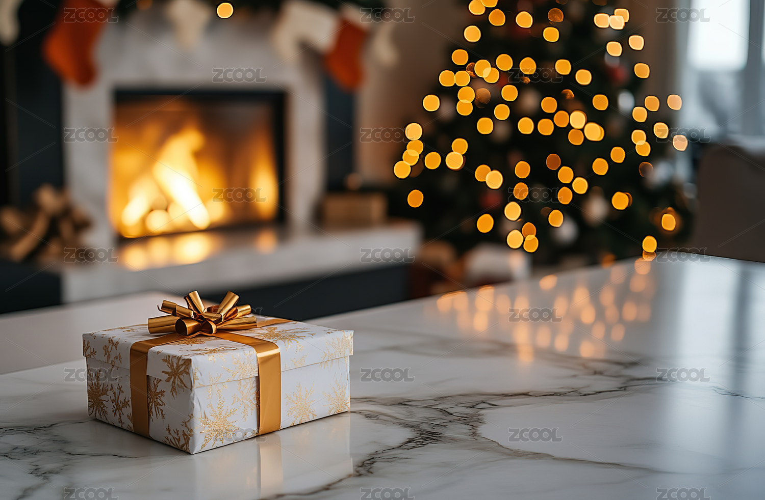圣诞节室内圣诞树礼盒和燃烧的壁炉